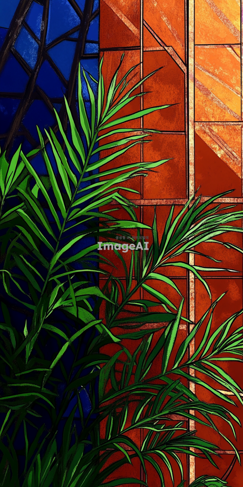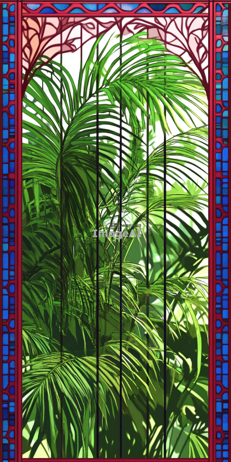 종려잎을 현대적으로 해석한 스태인드글라스, 기하학적 문양, 최대한 단순하게, 나무가지와 잎은 녹색, 배경은 파란색과 붉은색, 단색으로, 테두리 선은 굵게, 아래는 진하게 위로 갈수록 연하게 그라데이션, 색감이 돋보이는 디자인, 고풍스러운 느낌의 작품