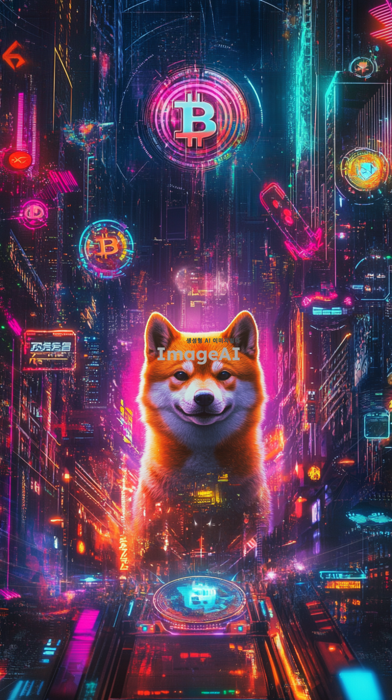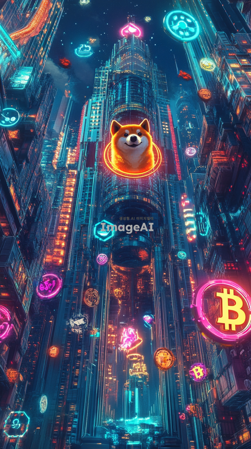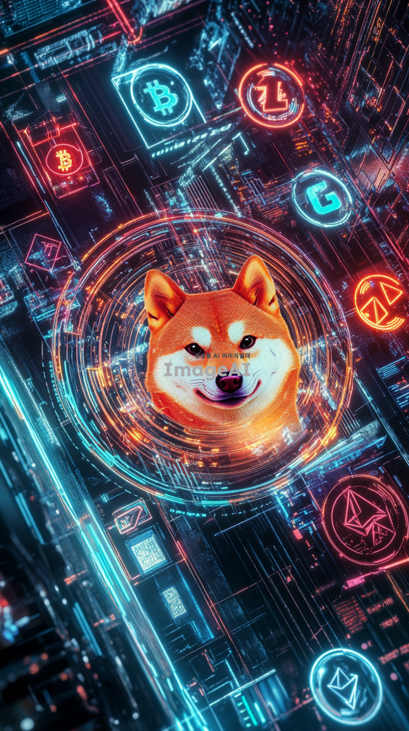 도지코인을 상징하는 밝고 유쾌한 분위기의 디지털 아트, 도지코인의 로고인 시바견이 중심에 있고 주변에는 다양한 암호화폐 아이콘들이 함께 배치된 모습, 배경은 미래지향적인 도시 풍경으로, 화려한 네온 불빛과 가상 현실을 연상시키는 요소들이 포함된 이미지.