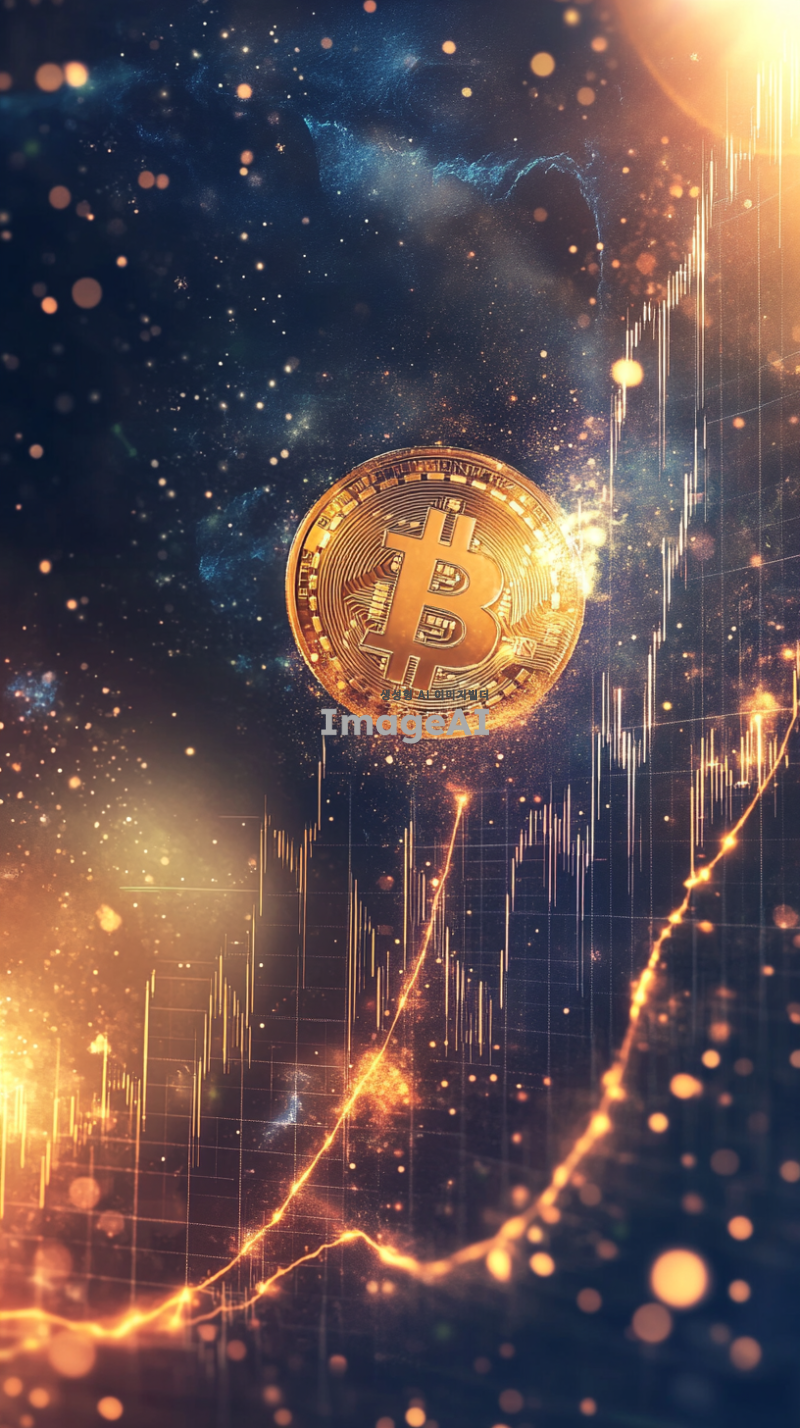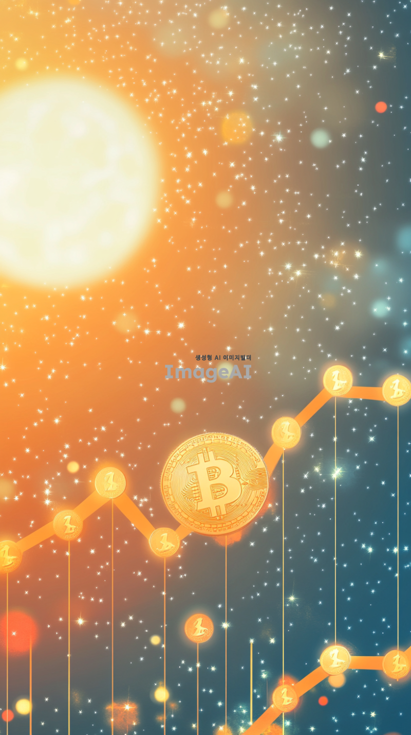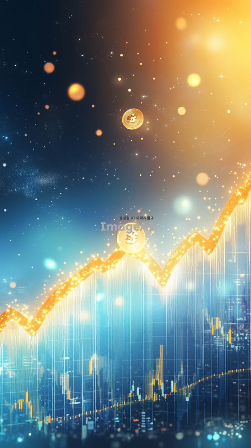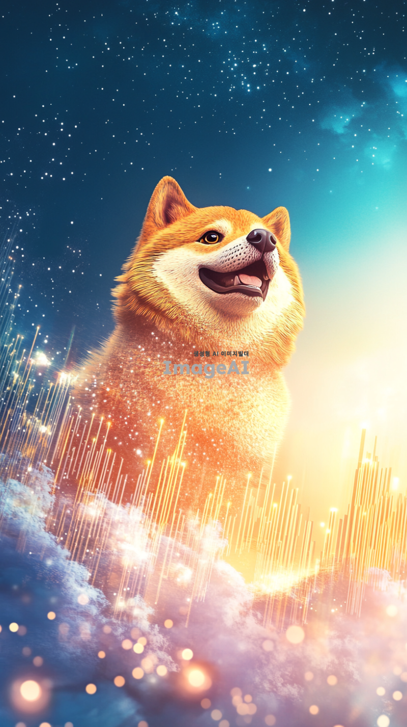 도지코인이 상승하는 모습을 상징적으로 표현하기 위해, 밝고 활기찬 배경의 금융 그래프 위로 도지코인의 로고가 크게 부각된 이미지. 그래프는 상승 곡선을 그리며, 배경은 푸른 하늘과 빛나는 태양으로 설정해 긍정적인 분위기를 강조. 도지코인의 로고는 반짝이는 금색으로 표현되어 눈에 띄게 하고, 주변에는 작은 별들이 반짝이며 축제와 같은 느낌을 더함.