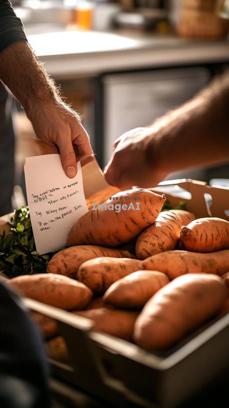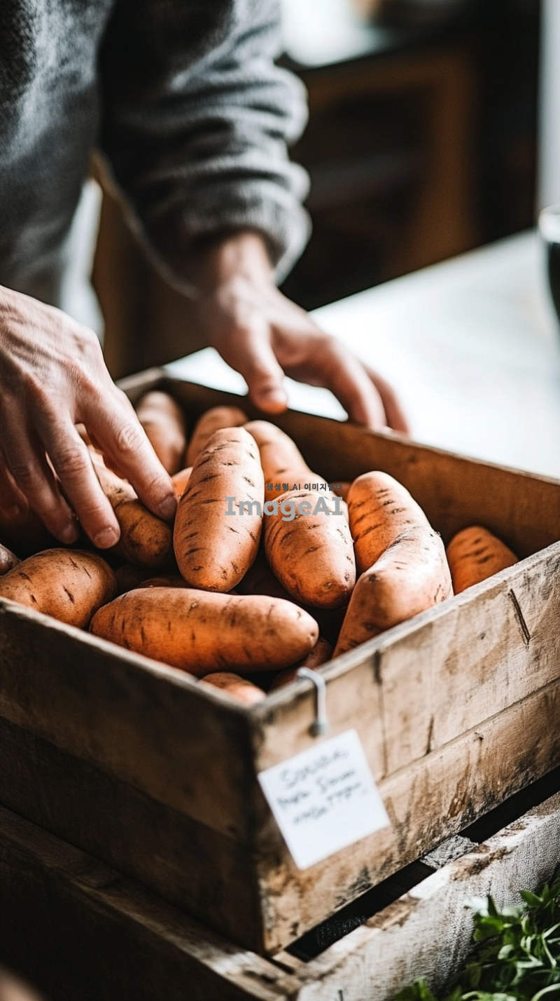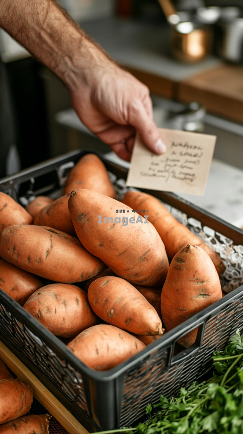 고구마 보관 방법을 설명하는 썸네일을 위한 이미지. 고구마가 신선하게 보관되어 있는 모습을 중심으로, 깨끗한 주방 환경에서 고구마가 상자나 바구니에 정리되어 있는 장면. 고구마의 색감이 잘 드러나도록 조명은 밝고 따뜻하게 설정. 고구마 옆에 보관 팁을 적은 작은 메모지가 놓여 있는 모습. 고구마를 손질하는 사람의 손이 자연스럽게 등장하여 실용적인 느낌을 강조.