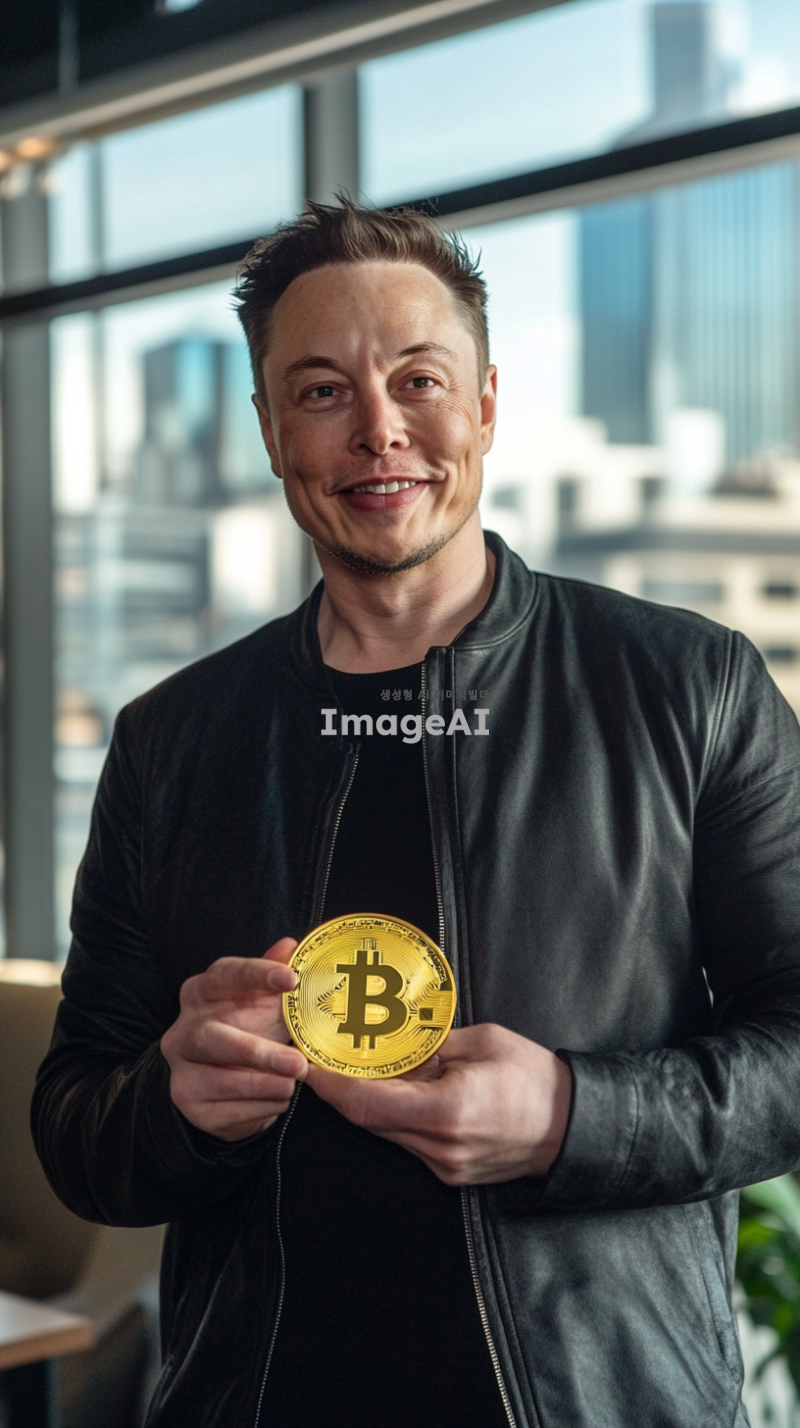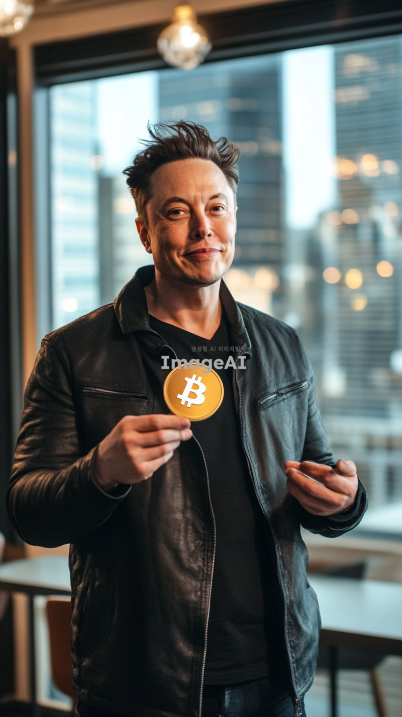 일론 머스크가 도지코인 로고가 있는 동전을 손에 들고 있는 모습, 배경은 현대적인 오피스, 창밖으로는 도시의 전경이 보이는 장면, 일론 머스크는 캐주얼한 옷차림, 미소를 짓고 있음, 밝고 미래지향적인 분위기.