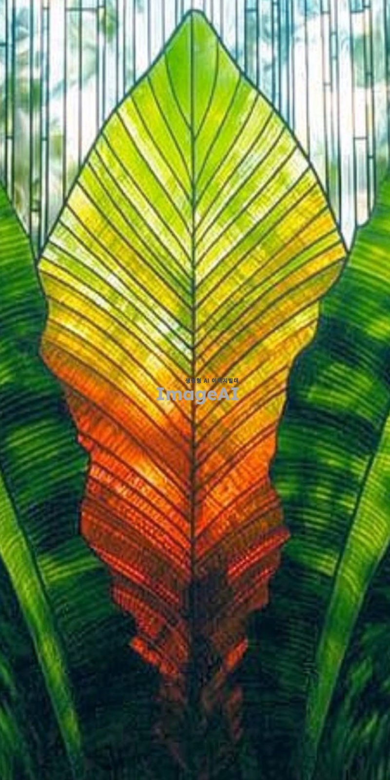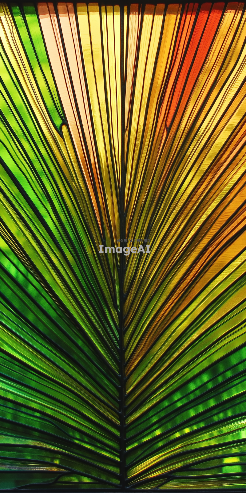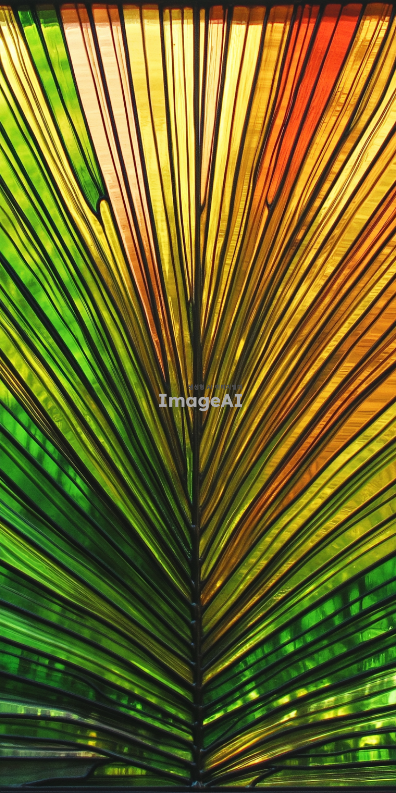 종려잎을 현대적으로 해석한 스태인드글라스, 단순화 한 기하학적 문양, 테두리 선은 굵게, 아래는 진하게 위로 갈수록 연하게 그라데이션, 색감이 돋보이는 디자인, 고풍스러운 느낌의 작품