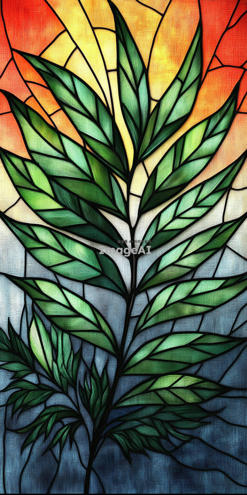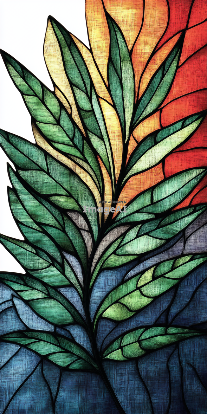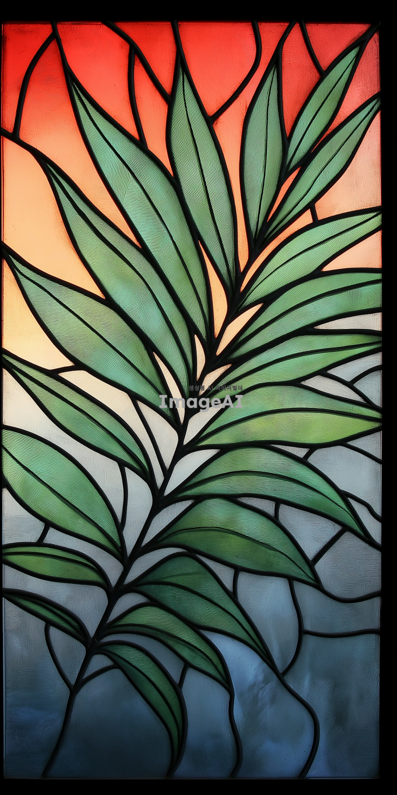 종려나무잎을 현대적으로 해석한 스태인드글라스, 최대한 단순화한 기하학적 문양, 문양의 테두리 선을 굵게, 나무가지와 잎은 녹색, 배경은 파란색과 붉은색을 원색으로 표현, 아래는 진하게 위로 갈수록 연하게 그라데이션, 색감이 돋보이는 디자인, 고풍스러운 느낌의 작품