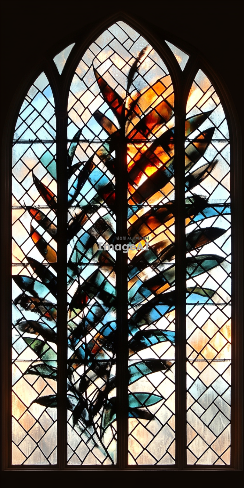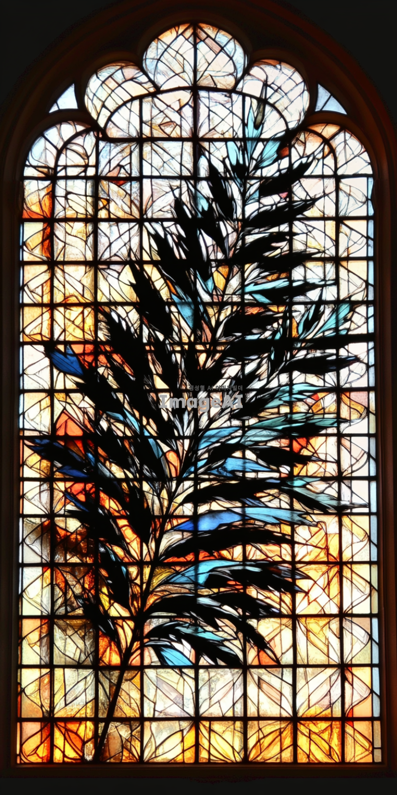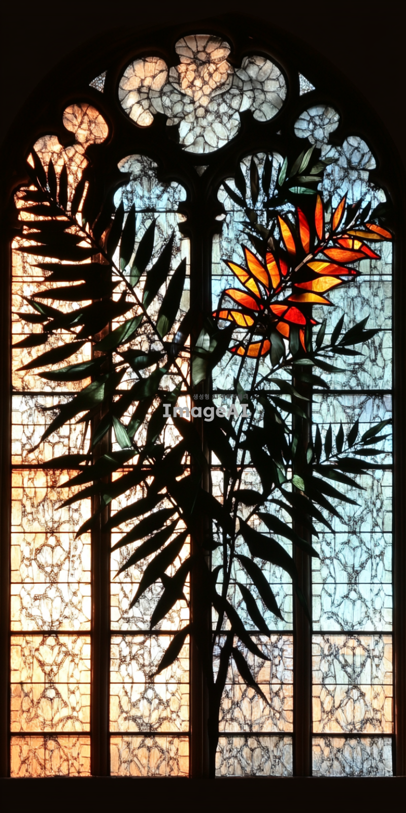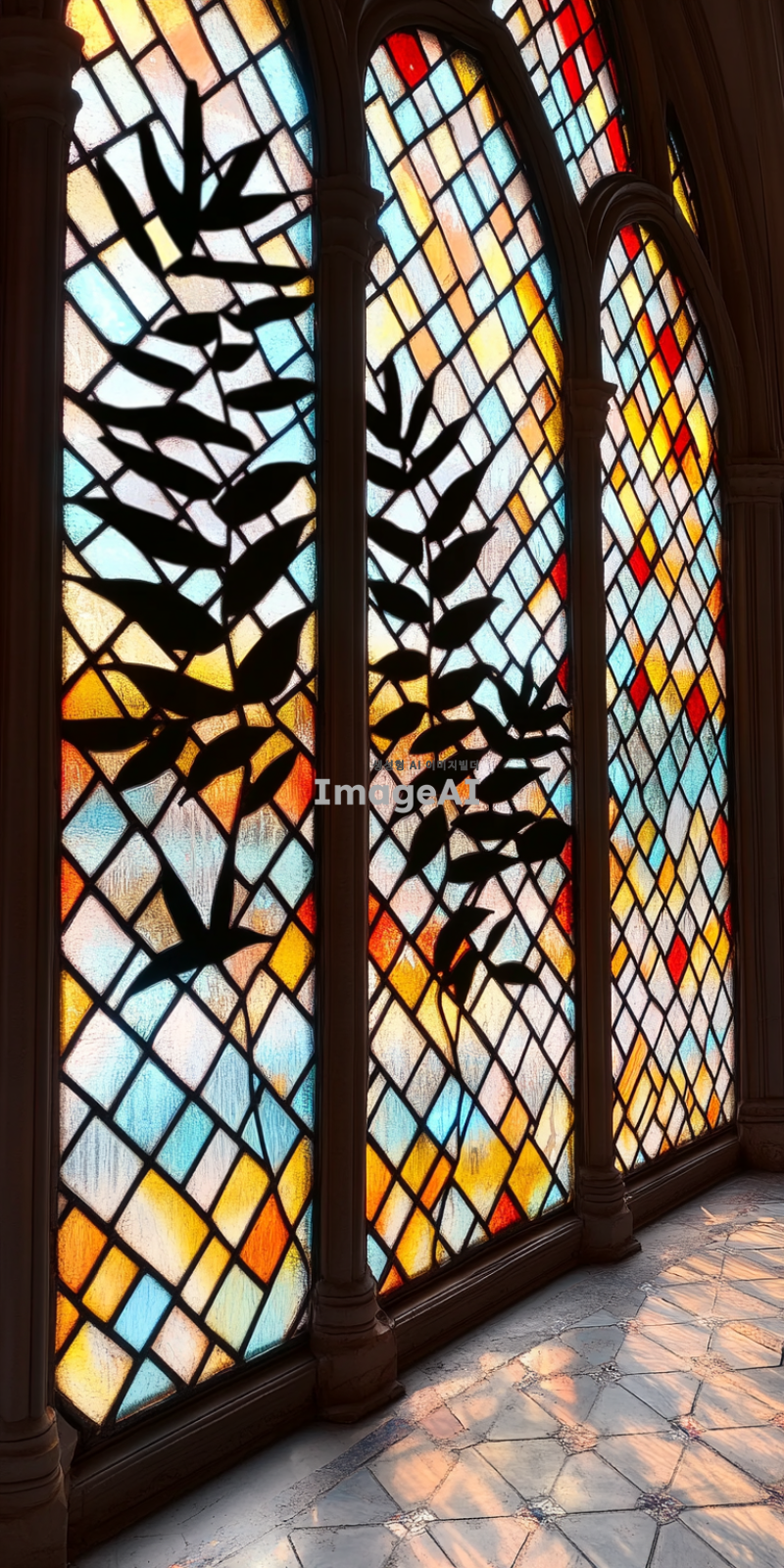 고풍스러운 성당의 창문에 있는 스테인드글라스, 다양한 색상의 유리 조각들이 햇빛을 받아 반짝이며 빛나는 모습, 복잡한 기하학적 무늬와 꽃 모양이 조화를 이루고 있는 디자인, 고대 중세 유럽의 예술적 스타일, 섬세하고 정교한 디테일, 따뜻한 색감의 조화, 성스러운 분위기, 평화롭고 조용한 느낌.
