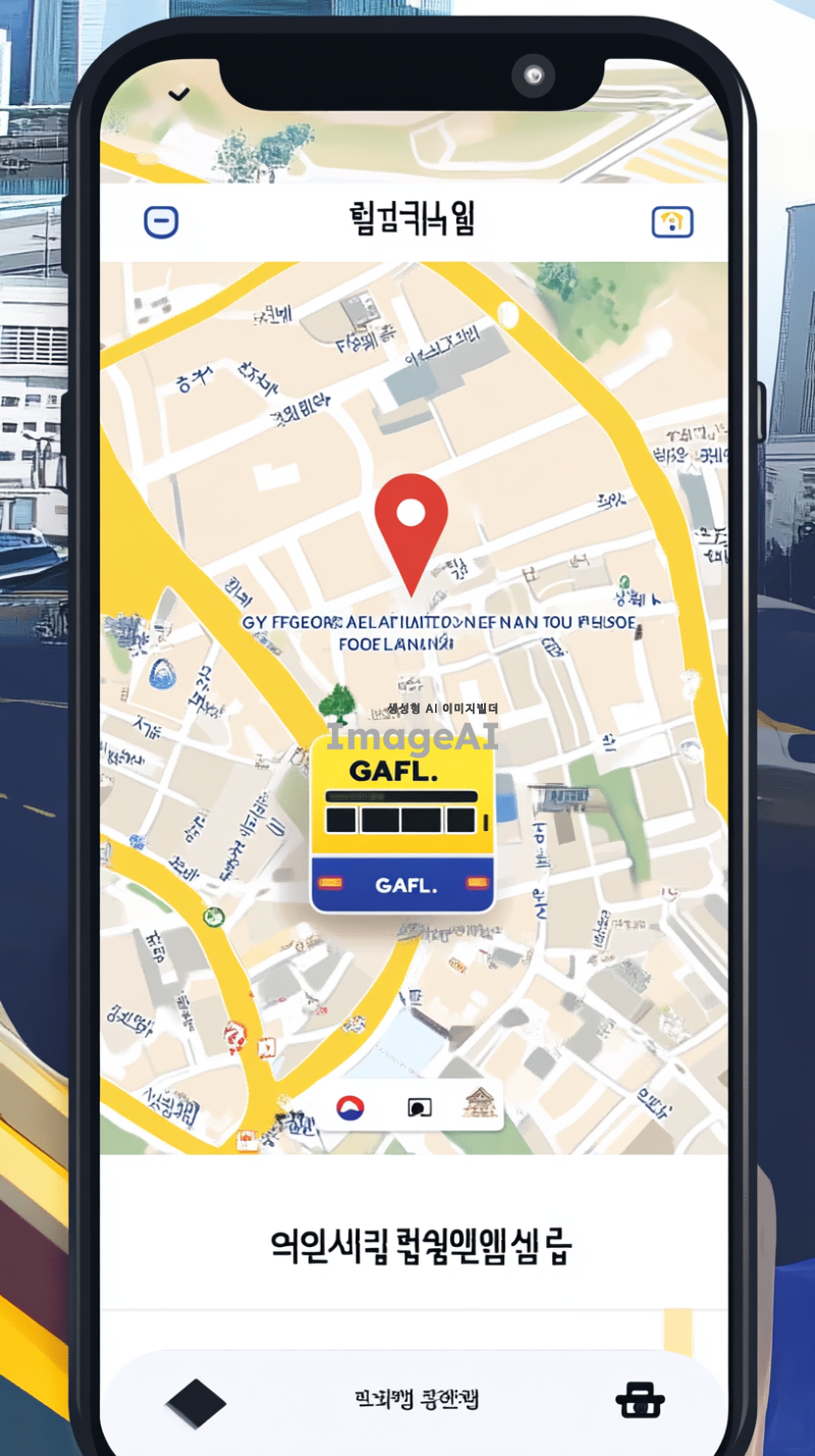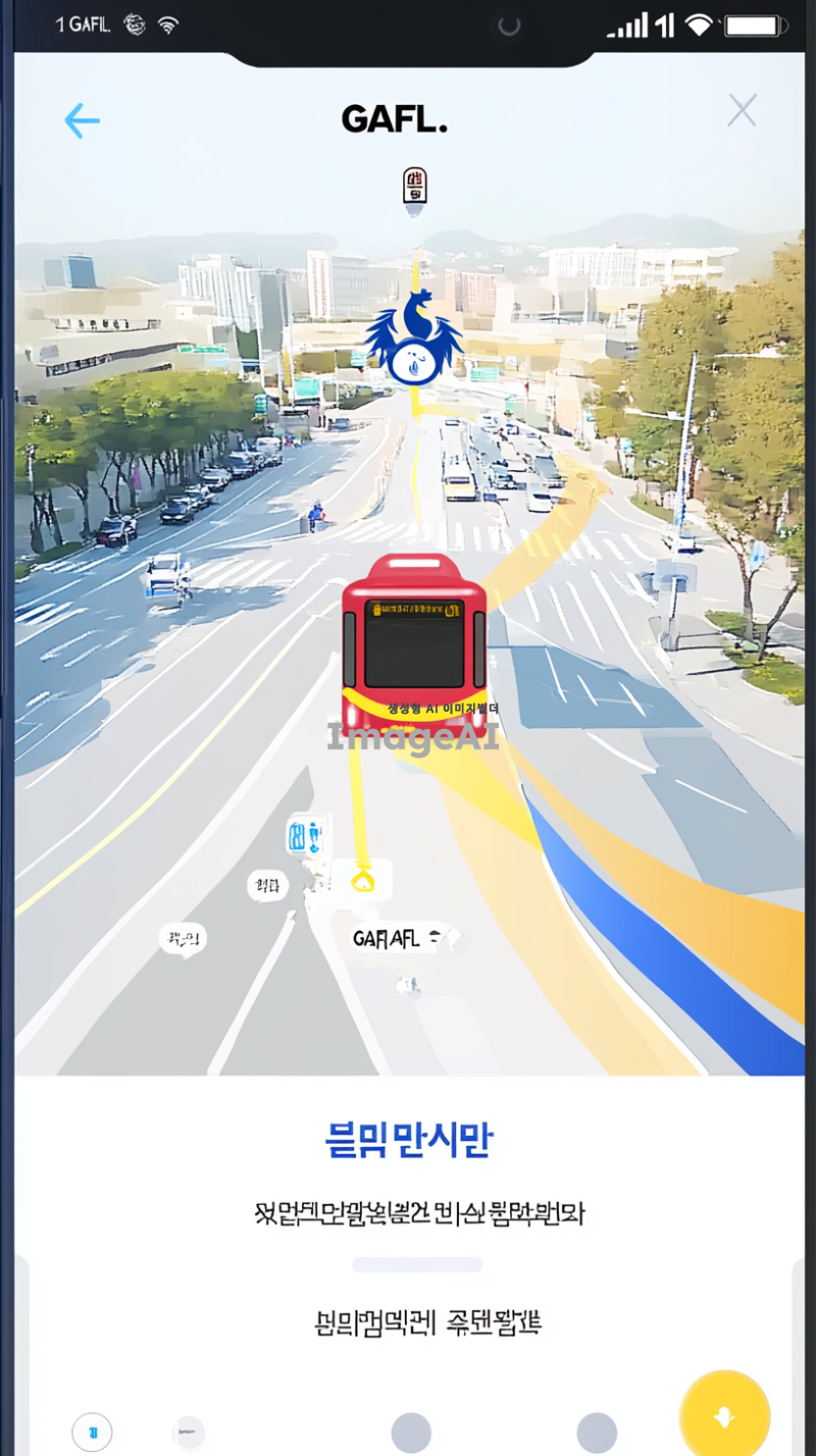 일단 흔히 지도 어플에서 볼 수 있는 듯한 디지털 느낌으 지도에서 학교가 있는데 그 학교 이름은 경기외고야. 경기외고를 지도에서의 현위치로 잡고 셔틀버스가 지도위에 아이콘으로 10분거리에 있어. 지도에는 버스 아이콘이 경기외고 즉 GAFL을 향해 달려오고 있어. 마치 택시어플에서 택시 기사가 10분뒤 도착한다는 화면처럼 경기외국어고등학교를 현위치로 잡고 버스 어플을 그려줘. 그치만 버스 아이콘은 빨간색과 노란색이 섞여있고 봉황이 위에 올라가 있었으면 좋겠어. 핸드폰 지도 처럼 나타내주고. 페인팅 느낌이 나지 않도록 주의해줘. 아무튼 학생이 셔틀 버스를 기다리면서 얼마 남았는지 지도로 확인하는 느낌인데 학생이런 요소들 다 빼고 그 휴대폰 안에 있는 지도만 캡처한것 처럼 구현해줘