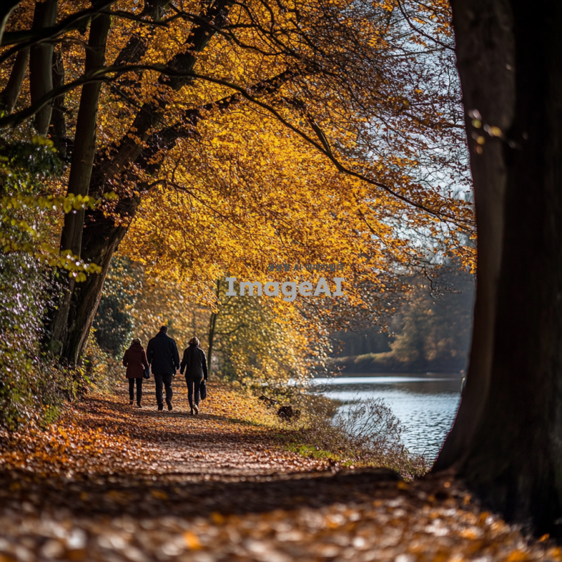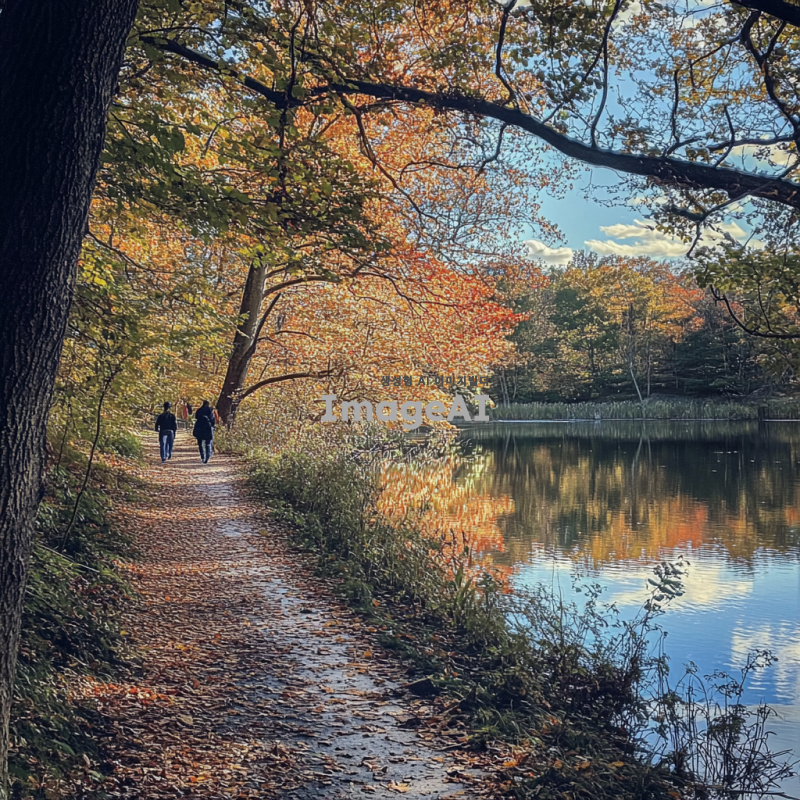가을의 따뜻한 햇살이 비치는 울긋불긋한 단풍으로 물든 숲길, 바람에 살랑이는 낙엽과 함께 걷는 사람들, 맑고 푸른 하늘 아래 평화로운 분위기, 주변에 호수가 있어 물에 비치는 단풍의 반영, 부드러운 빛과 그림자가 어우러진 장면, 가을의 정취를 느낄 수 있는 풍경.