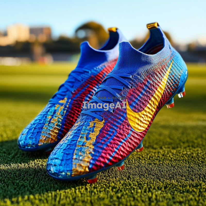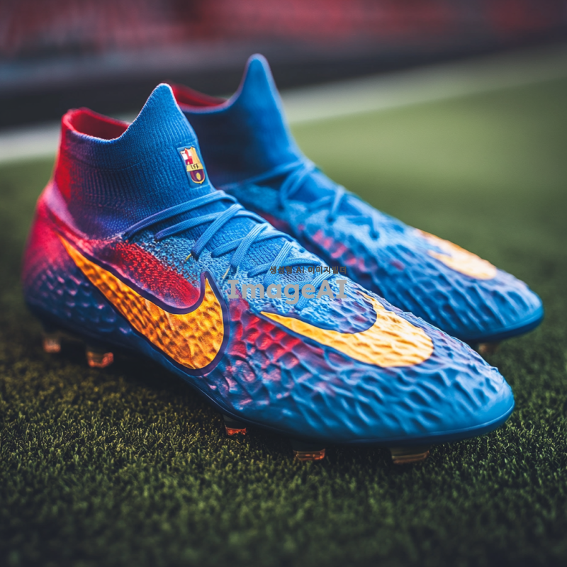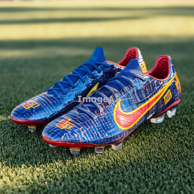 바르셀로나 클럽의 전통적인 색상인 블루와 레드가 조화롭게 디자인된 나이키 축구화, 축구화 측면에 바르셀로나 클럽 로고가 세련되게 배치된 모습, 축구화의 디자인은 현대적이고 역동적인 느낌을 주며, 고급스러운 소재로 제작된 디테일이 돋보이는 모습, 배경은 축구 경기장 잔디 위에 놓인 장면.
