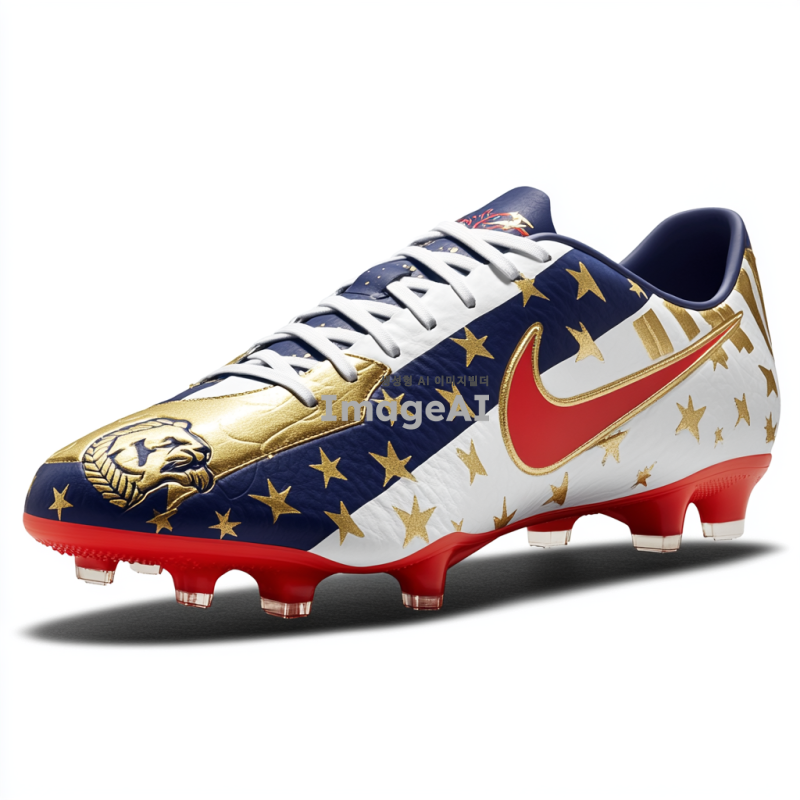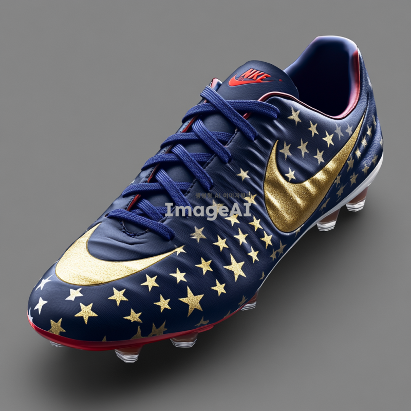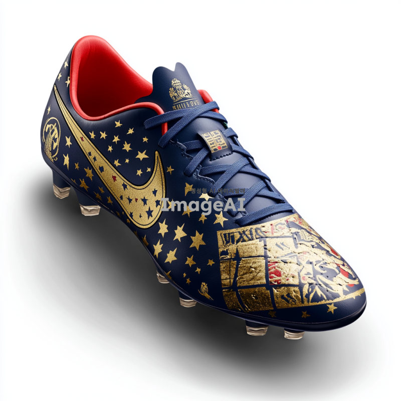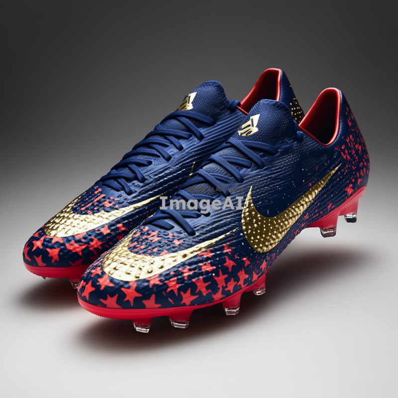 파리생제르망 FC의 상징적인 색상인 파란색과 빨간색을 활용한 나이키 축구화 디자인, 에펠탑의 실루엣과 별 모양의 패턴을 포함한 세련된 스타일.