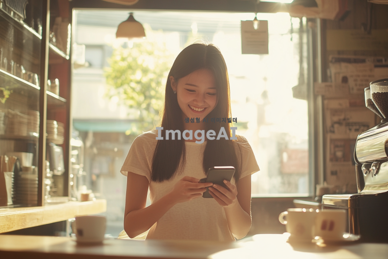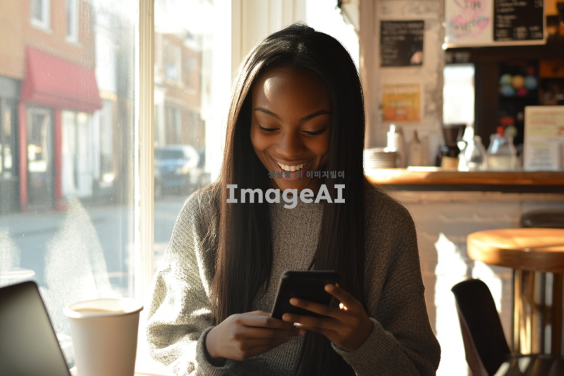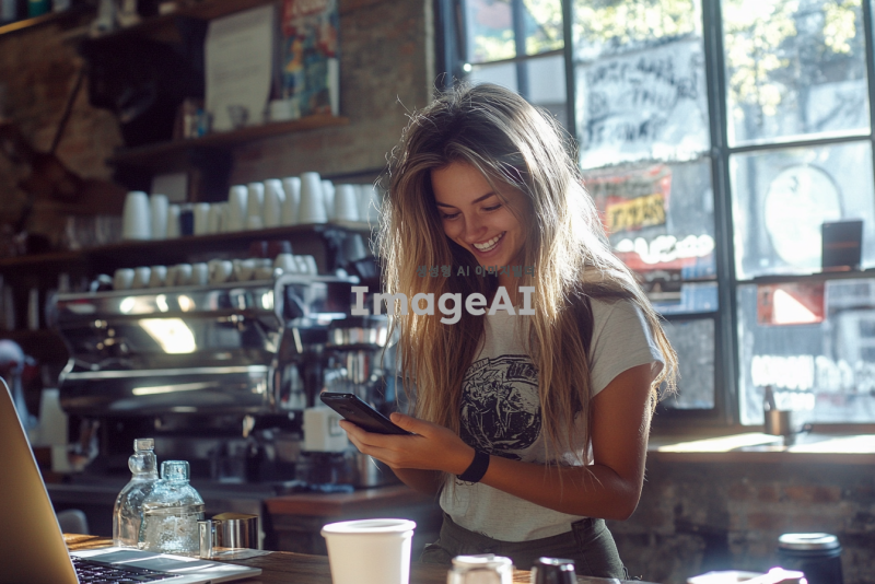 밝은 카페에서 스마트폰을 보고 웃으며 대화하는 20대 초반 여성, 긴 생머리, 캐주얼한 옷차림, 주변에는 커피잔과 노트북, 창밖으로 햇살이 들어오는 장면, 현대적이고 편안한 분위기.