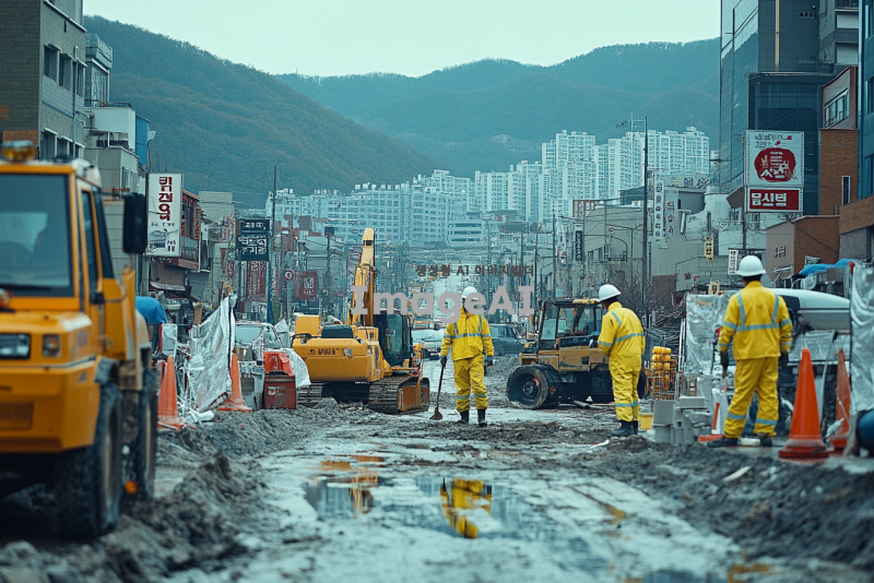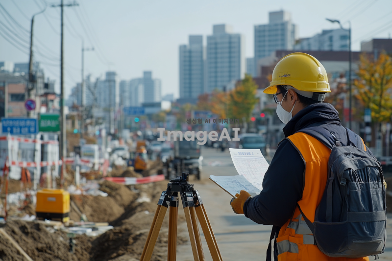 한국도로교통공단의 건축 현장에서 석면 위해성 평가를 수행하는 장면. 안전모와 보호 장비를 착용한 한국인 전문가들이 현장에서 석면 샘플을 채취하고 분석하는 모습. 주변에는 다양한 건축 장비와 도로교통 관련 표지판이 배치되어 있으며, 안전을 위해 경고 테이프가 설치되어 있는 상황. 전문가들은 집중하여 작업을 수행하고 있으며, 배경에는 현대적인 도시 풍경이 펼쳐져 있다. 작업 현장은 밝은 낮 시간이며, 전문가들의 표정은 진지하고 전문적이다.