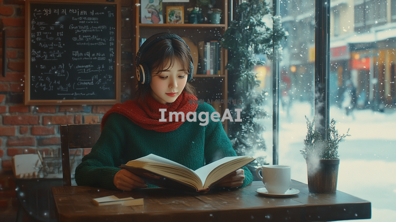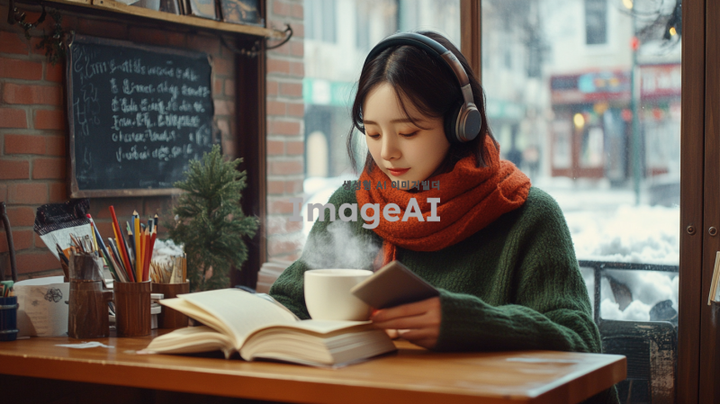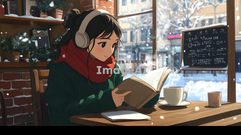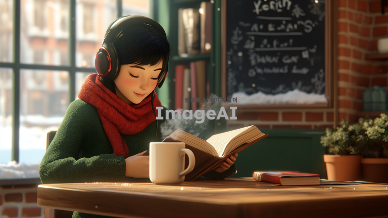 중년의 여성으로, 귀여운 한국 가수 아이유를 닮은 예림이라는 이름의 인물이 헤드폰을 착용하고 나무 테이블에 앉아 책을 읽고 있는 모습. 이 인물은 녹색 스웨터와 빨간색 스카프를 착용하고 있다. 테이블 위에는 손잡이가 있는 김이 나는 흰색 머그잔, 필통, 펼쳐진 책이 놓여 있다. 배경에는 벽돌 벽과 선반이 있으며, 선반 위에는 화분, 책, 액자에 담긴 그림들이 있다. 벽에는 프랑스어로 쓰인 칠판 메뉴가 걸려 있다. 카페에는 큰 창문이 있어 바깥 거리와 건물이 보인다. 창문에는 눈이 쌓여 있고, 전체적인 분위기는 따뜻하고 매력적이며 평화롭고 공부하기 좋은 환경을 암시한다.