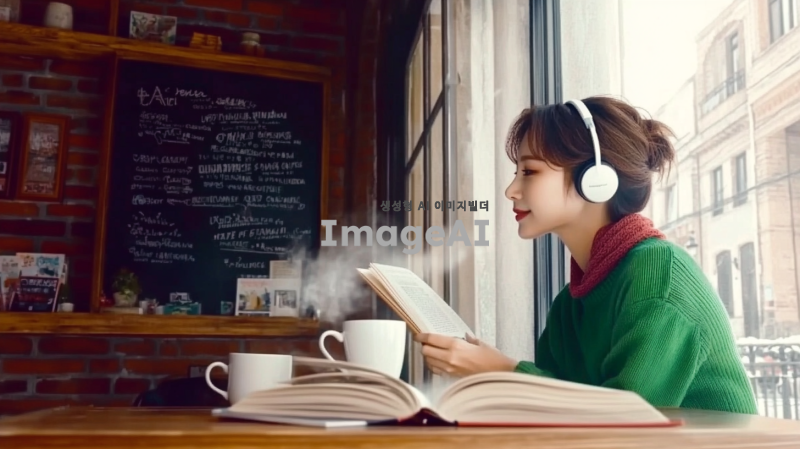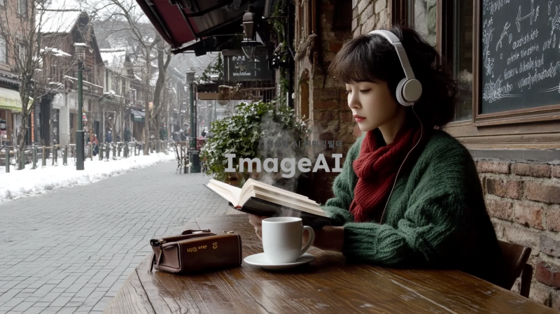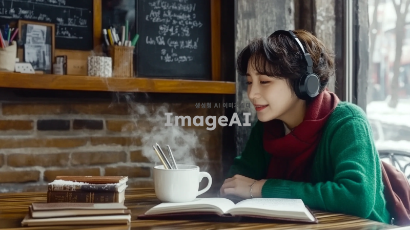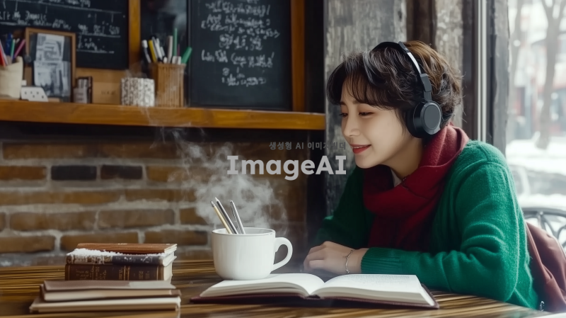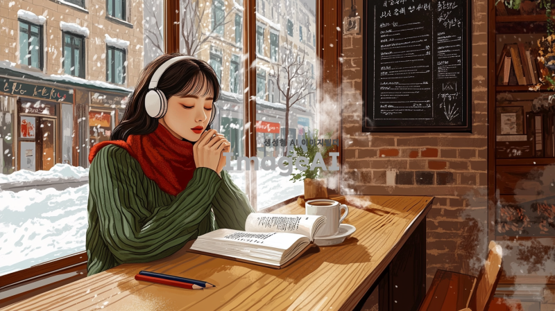 중년 여성, 아이유를 닮은 귀여운 한국인 가수, 헤드폰을 쓴 예림, 아늑한 카페의 나무 테이블에 앉아 책을 읽고 있다. 그녀는 초록색 스웨터와 빨간색 스카프를 착용하고 있다. 테이블 위에는 손잡이가 있는 하얀 머그잔에서 김이 나고 있으며, 필통과 펼쳐진 책이 놓여 있다. 배경에는 벽돌 벽이 있고, 선반에는 화분, 책, 액자에 담긴 그림들이 놓여 있다. 벽에는 프랑스어로 적힌 칠판 메뉴가 걸려 있다. 카페는 큰 창문이 있어 바깥 거리와 건물이 보인다. 창문에는 눈이 쌓여 있으며, 전체적인 분위기는 따뜻하고 매력적이며, 평화롭고 공부하기 좋은 환경을 암시한다.