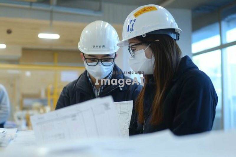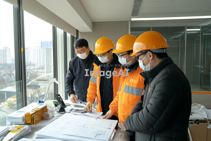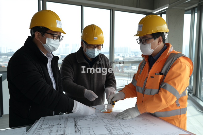 한국도로교통공단의 건축물 내부에서 석면 위해성 평가를 수행하는 장면, 안전모와 보호 마스크를 착용한 전문가들이 석면 샘플을 채취하고 분석하는 모습, 주변에는 건축 도면과 전문 장비들이 놓여 있으며, 현대적이고 깔끔한 사무실 환경, 전문가들은 진지하고 집중된 표정으로 작업에 임하고 있는 장면, 자연광이 들어오는 넓은 창문과 정돈된 공간 배치.
