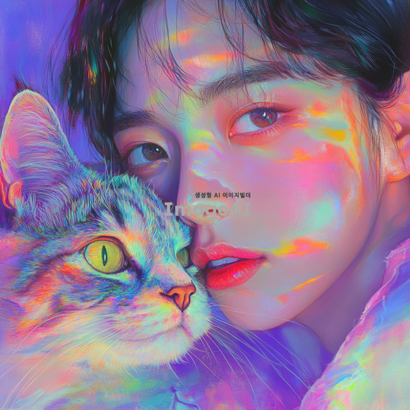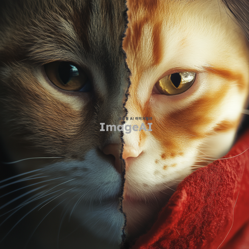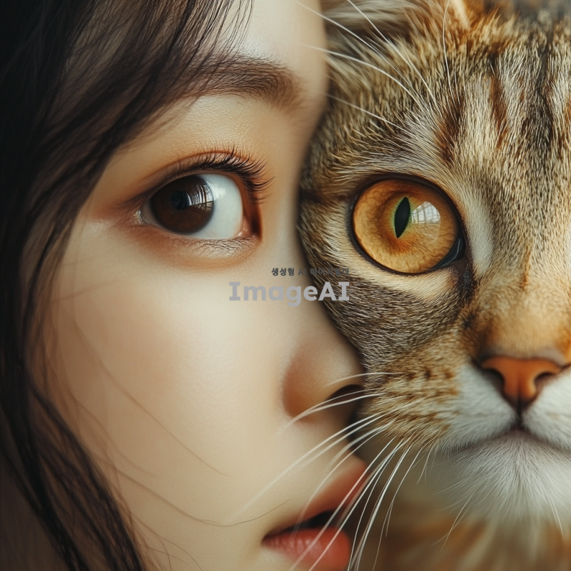 한국인의 얼굴과 고양이 얼굴이 조화롭게 합쳐진 이미지, 부드럽고 자연스러운 전환, 따뜻하고 친근한 표정, 세밀한 디테일로 표현된 털과 피부, 밝고 화사한 배경, 조화로운 색감.