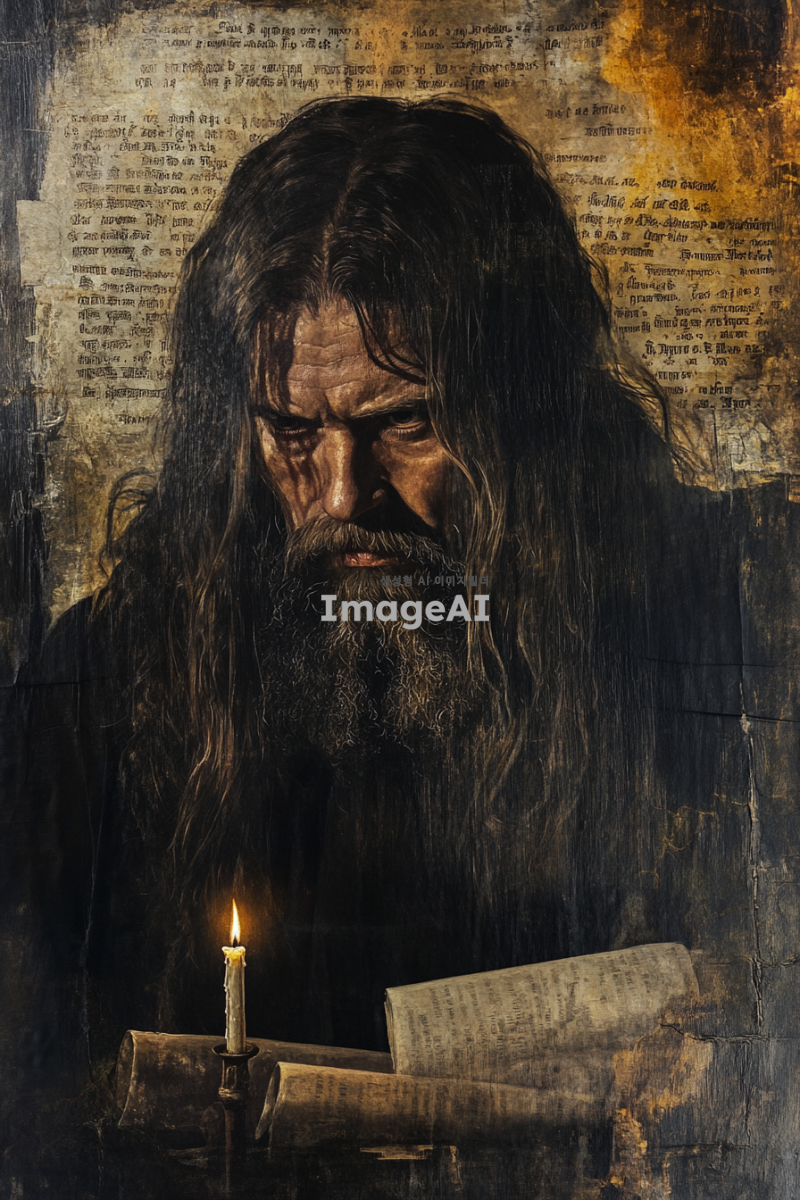 중세 시대의 성경 장면을 배경으로, 깊은 사색에 잠긴 사도 요한. 그의 주변에는 고대의 두루마리와 깃펜이 놓여 있으며, 희미한 촛불이 은은한 빛을 발하고 있다. 요한은 긴 머리와 수염을 가진 모습으로, 그의 눈빛은 지혜와 신비로 가득 차 있다. 배경에는 고대 성경의 구절들이 새겨진 벽이 보이며, 창문을 통해 들어오는 빛이 신성한 분위기를 더해준다.
