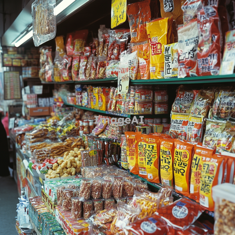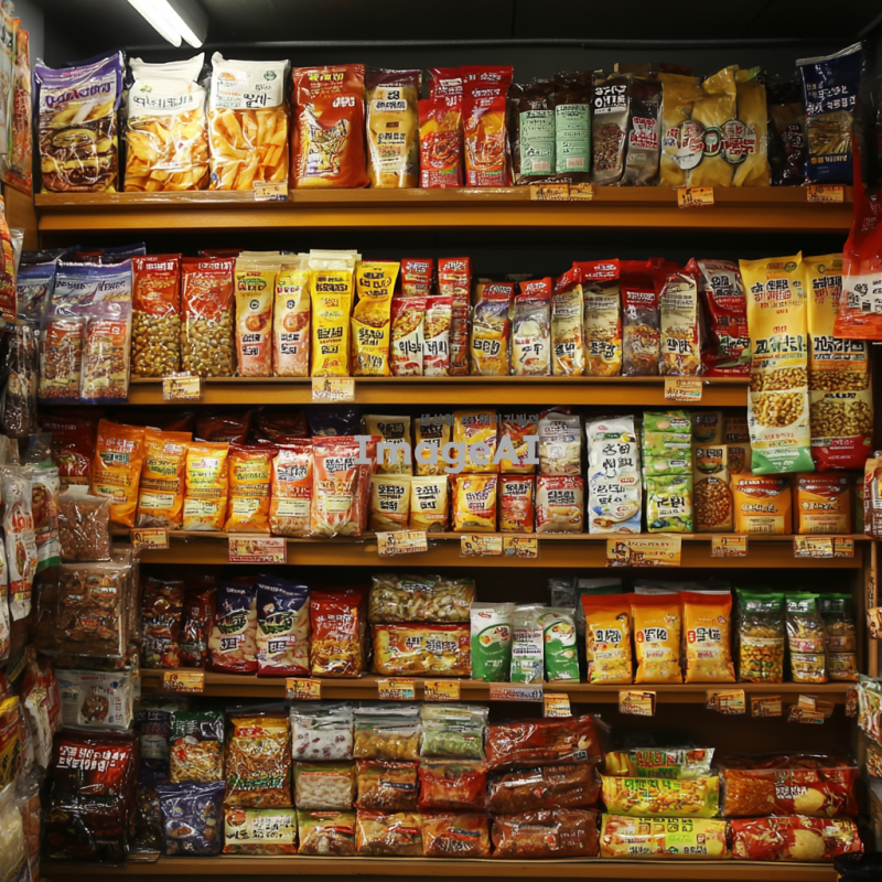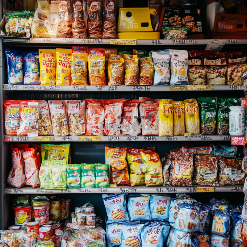 한국의 전통 시장에서 다양한 초가공식품이 진열된 모습, 화려한 색상의 포장지와 다양한 브랜드의 제품들이 선반에 가득 차 있는 장면. 각 제품에는 한글로 적힌 독특한 이름과 설명이 보이며, 시장의 활기찬 분위기와 사람들이 제품을 살펴보는 모습이 함께 표현됨. 다양한 종류의 과자, 음료수, 즉석식품 등이 포함되어 있고, 시장의 전통적인 분위기와 현대적인 제품의 조화가 돋보임.