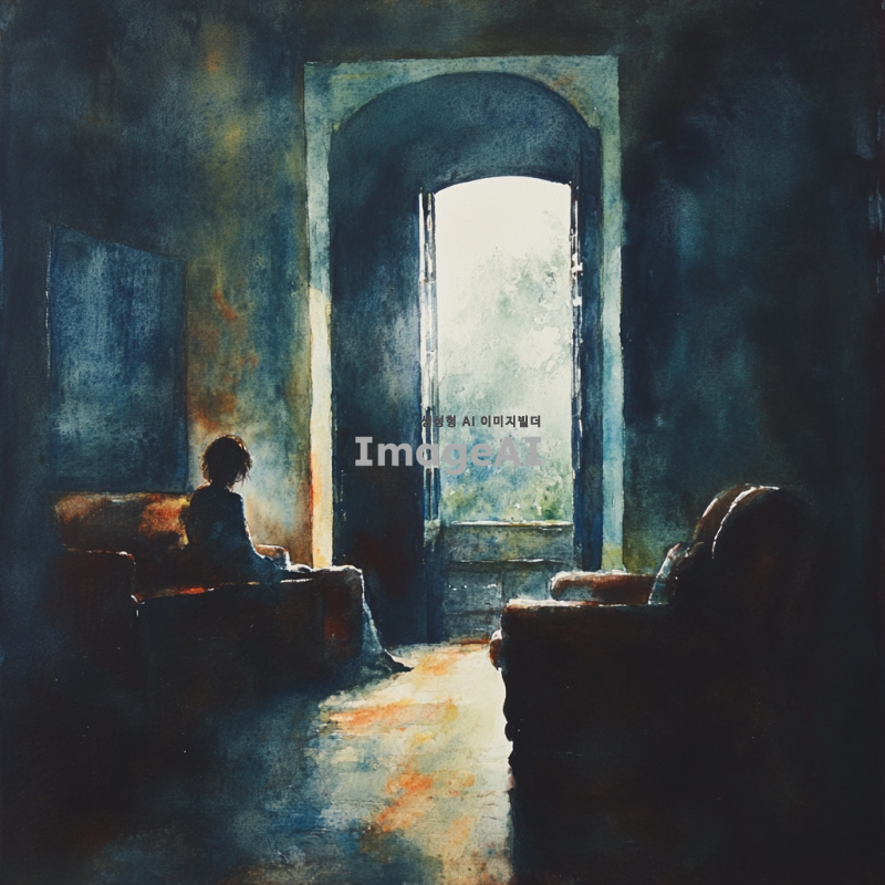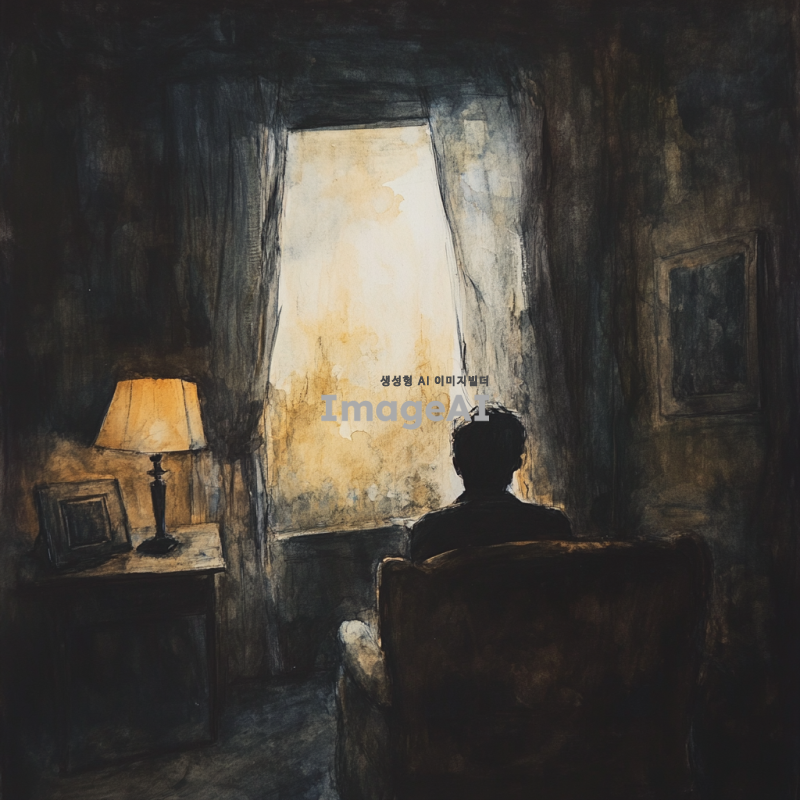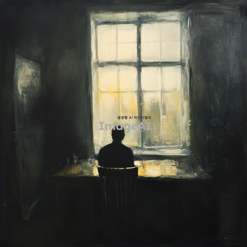 어두운 방 안에서 창밖을 바라보는 사람, 창문을 통해 들어오는 빛이 방 안을 부드럽게 비추고 있으며, 방의 형체는 낭만주의적 스타일로 뭉그러져 있다. 유화와 수채화 기법이 조화를 이루어 어둡고 신비로운 분위기를 강조하며, 창밖의 빛은 따뜻하고 희망적인 느낌을 준다. 방 안의 가구와 소품들은 흐릿하게 표현되어 있고, 전체적으로 부드러운 색조와 질감이 돋보인다.