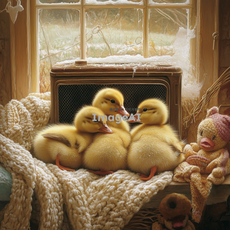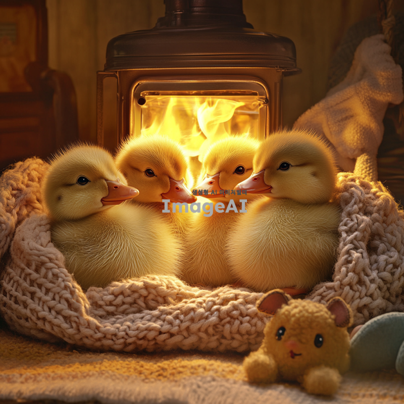 따뜻한 방 안에서 히터를 쬐고 있는 아기 오리 3마리, 아기 오리들은 부드러운 노란색 털을 가지고 있으며, 서로 가까이 모여 앉아 있음, 히터에서 나오는 온기가 아기 오리들을 포근하게 감싸고 있는 모습, 방 안은 아늑하고 편안한 분위기, 아기 오리들의 귀여운 표정과 몸짓이 강조됨, 주변에는 부드러운 담요와 장난감들이 놓여져 있음.