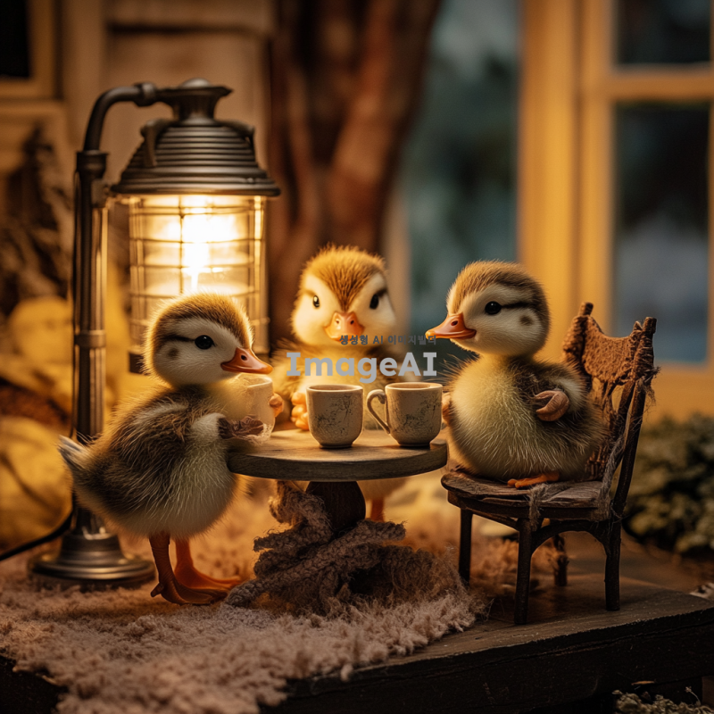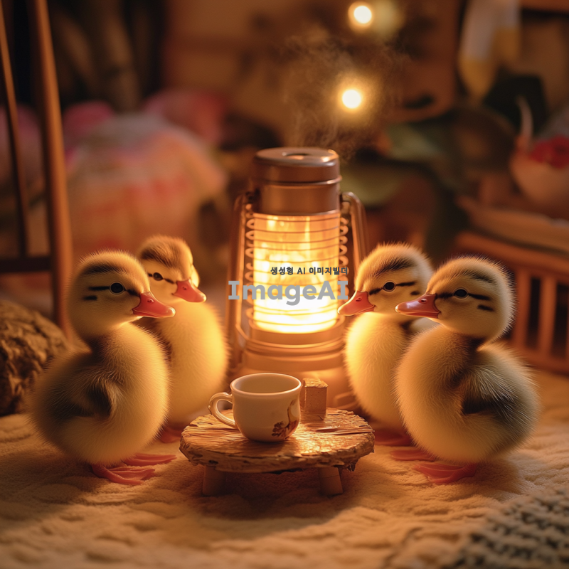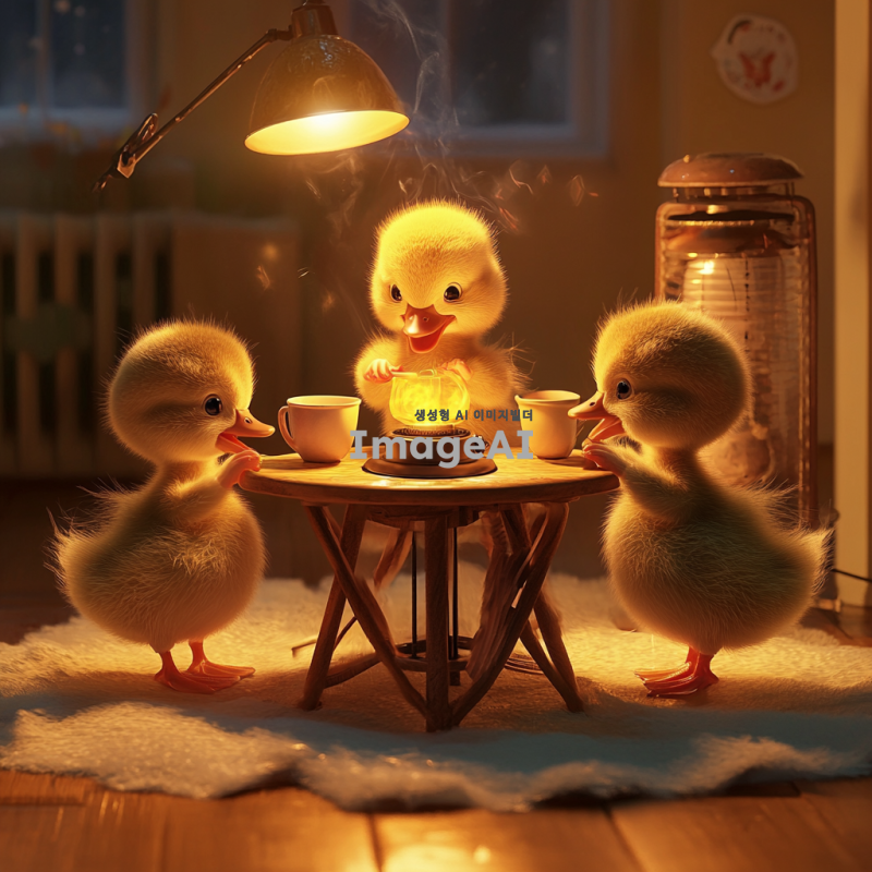 따뜻한 실내 공간에서 아기오리 3마리가 작은 테이블 주위에 모여 앉아 있다. 각 오리는 작은 잔을 들고 있으며, 얼굴에는 즐거운 표정이 가득하다. 테이블 옆에는 히터가 놓여 있어 오리들이 따뜻함을 느끼고 있다. 오리들은 각각 다양한 색의 깃털을 가지고 있으며, 귀엽고 우스꽝스러운 포즈를 취하고 있다. 주변은 아늑하고 편안한 분위기로, 배경에는 부드러운 조명이 비치고 있다.