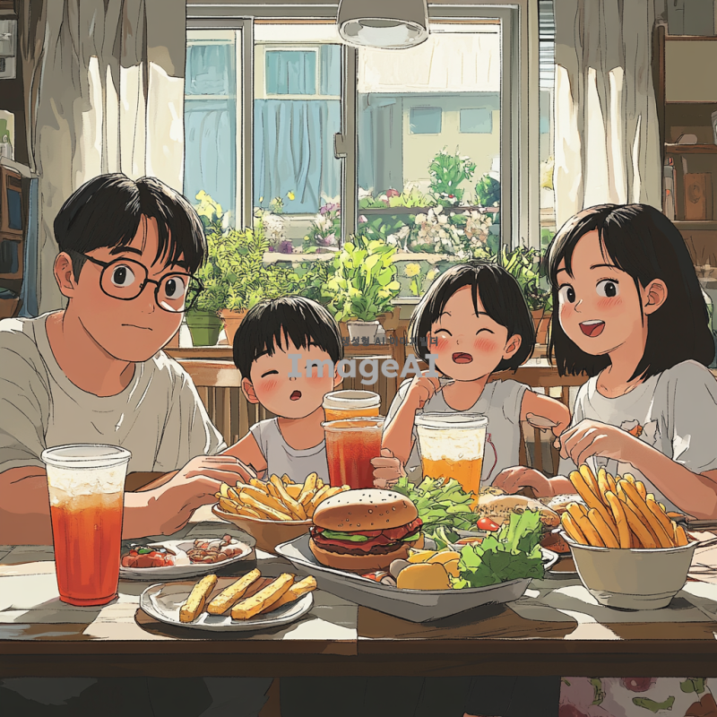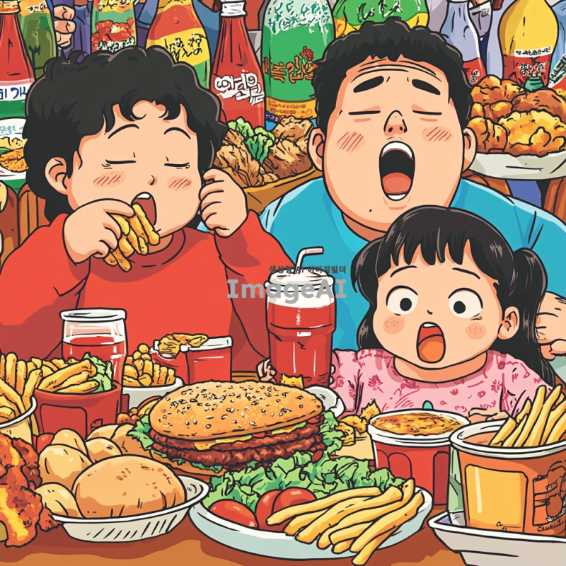 초가공식품을 먹고 있는 한국인 가족이 식탁에 앉아 있는 장면, 가족의 얼굴에는 피곤하고 건강이 나빠 보이는 표정이 나타나고, 식탁 위에는 햄버거, 감자튀김, 탄산음료와 같은 초가공식품이 가득 놓여 있음. 배경에는 자연에서 자란 신선한 과일과 채소가 그려져 있지만, 가족은 이를 외면하고 있는 모습. 전체적으로 밝고 경쾌한 카툰 스타일로 표현.