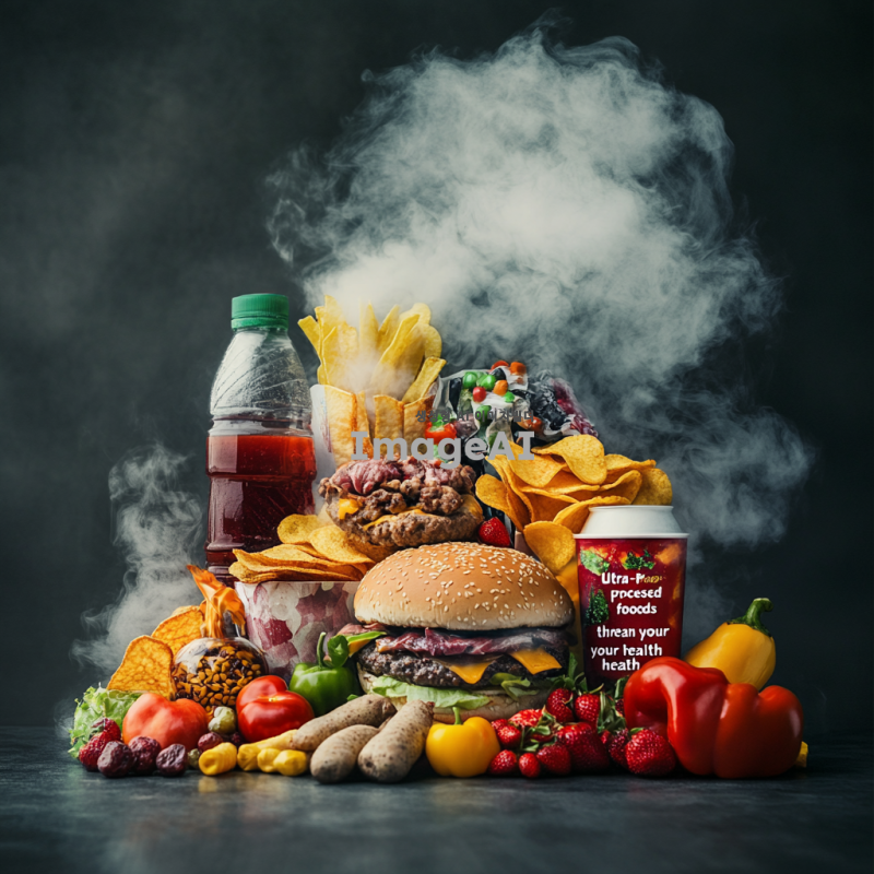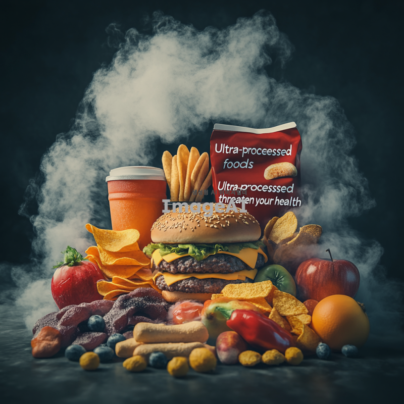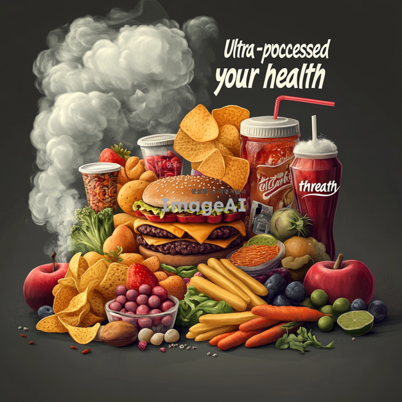 건강에 좋지 않은 초가공식품을 강조하는 이미지, 배경은 어두운 회색 톤, 중앙에 다양한 초가공식품들이 쌓여 있는 모습, 햄버거, 감자칩, 탄산음료, 사탕 등이 포함되어 있으며, 이 음식들 위로 연기가 피어오르는 듯한 효과, 음식들이 점차 녹아내리는 듯한 모습, 주변에 건강을 상징하는 신선한 과일과 채소가 작게 배치되어 대조를 이루는 장면, 이미지 상단에 "초가공식품, 건강을 위협합니다"라는 문구를 굵고 선명한 글씨체로 삽입.