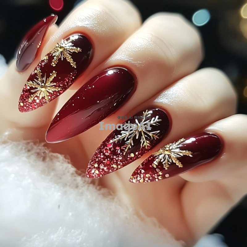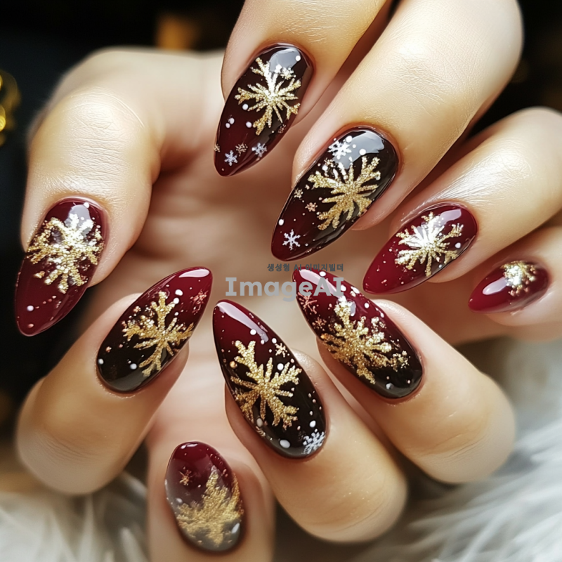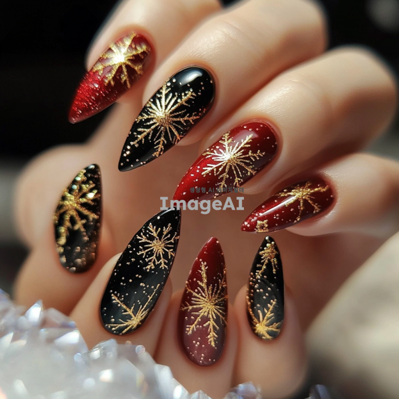 겨울 테마의 유니크한 네일아트 디자인, 자석네일 스타일, 레드와 골드 색상 조합, 반짝이는 눈송이 패턴, 고급스러운 느낌, 섬세하고 정교한 디테일, 한국인의 손톱에 어울리는 디자인, 세련되고 현대적인 분위기, 차가운 겨울을 연상시키는 배경.