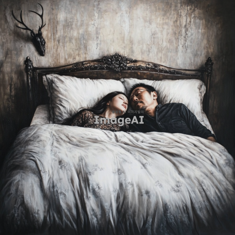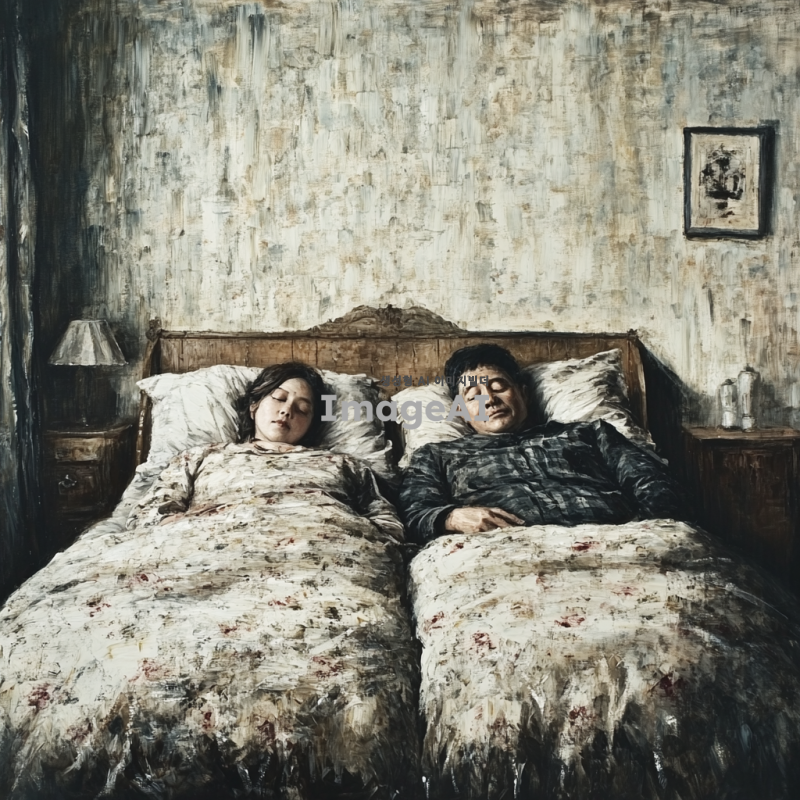 고희 스타일의 유화, 침대에 편안하게 누워 있는 한국인 남녀, 거친 붓터치, 따뜻하고 부드러운 색조, 은은한 빛이 비치는 침실, 세련된 분위기, 감성적이고 평화로운 느낌.
