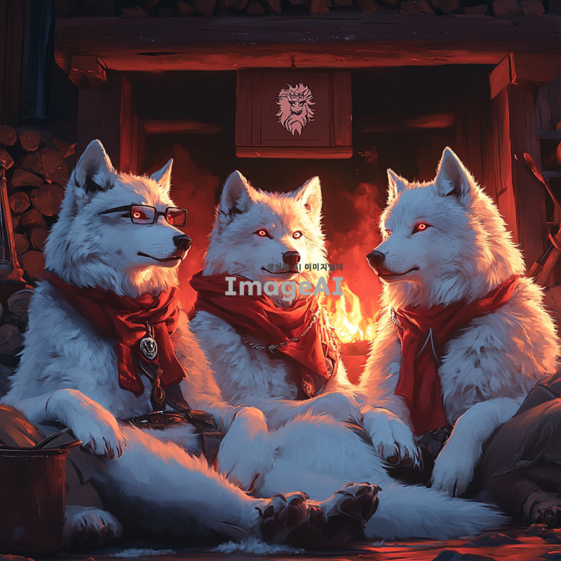 가족으로 보이는 다이아울프 늑대 3마리 다들 털이 하얗고 눈은 빨간색이야. 한 마리는 안경을 썻고 다른 한마리는 빨간 목도리 마지막 한마리는 그냥 있어. 오두막으로 보이는 집에서 난로를 앞에두고 있어. 그들 뒤의 오두막에 액자가 작게 걸려있는데 그건 왕좌의 게임에 나오는 스타크 가문의 문양이 있고 배경은 그냥 평범한 오두막이야. 난로를 앞에 두고 있으니까 얼굴이랑 몸에는 조금의 빨간 빛이 반사되어 나오고 있어