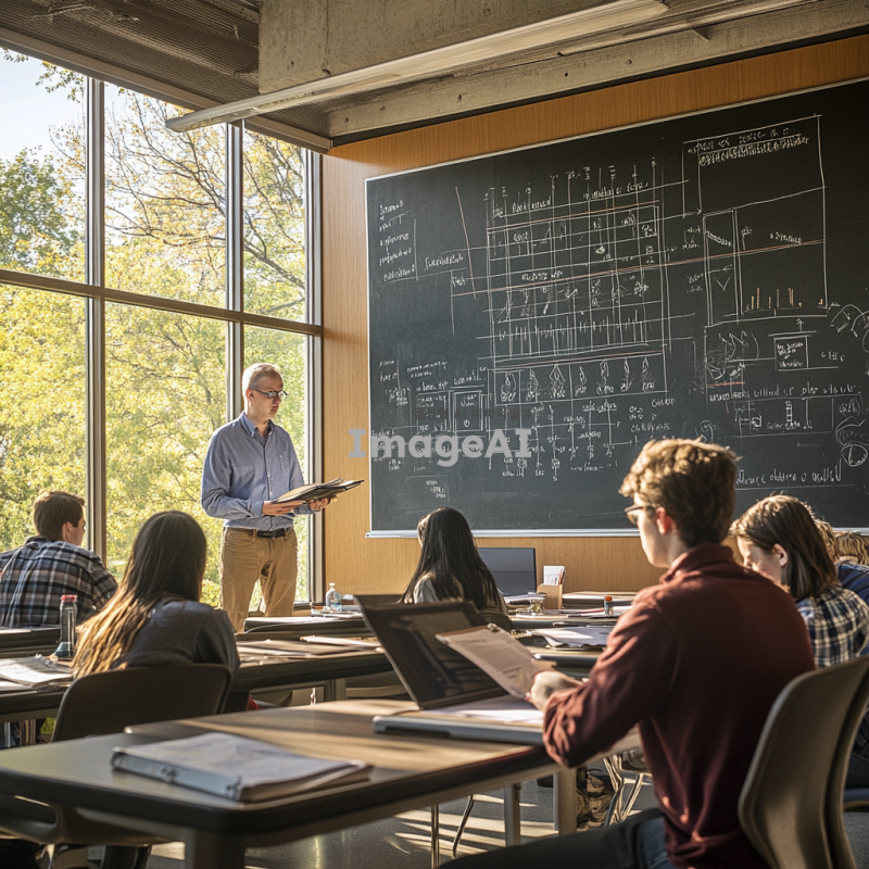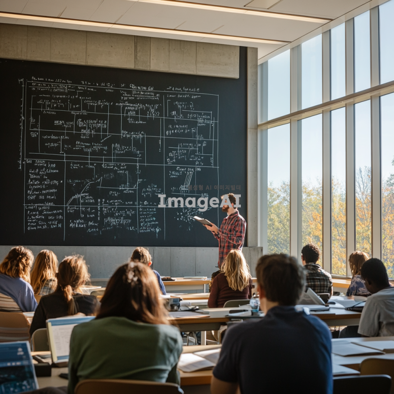 토목환경공학과 강의실에서 학생들이 열심히 공부하고 있는 장면, 커다란 창문을 통해 햇빛이 들어오는 현대적인 강의실, 학생들은 다양한 교과서를 펼쳐놓고 있으며 칠판에는 복잡한 수식과 다이어그램이 그려져 있다, 교수는 앞에 서서 설명하고 있으며 학생들은 노트에 필기하고 있다, 강의실 벽에는 토목공학 관련 포스터와 모형이 전시되어 있다, 학생들은 편안한 옷차림으로 진지하게 강의에 집중하고 있다.