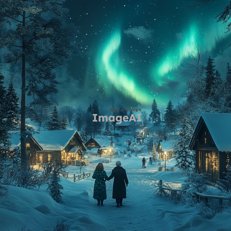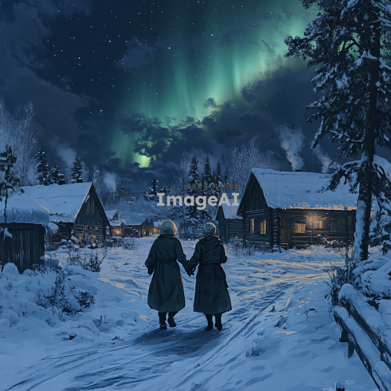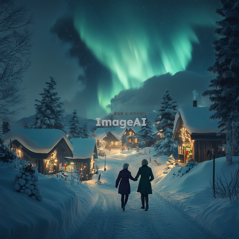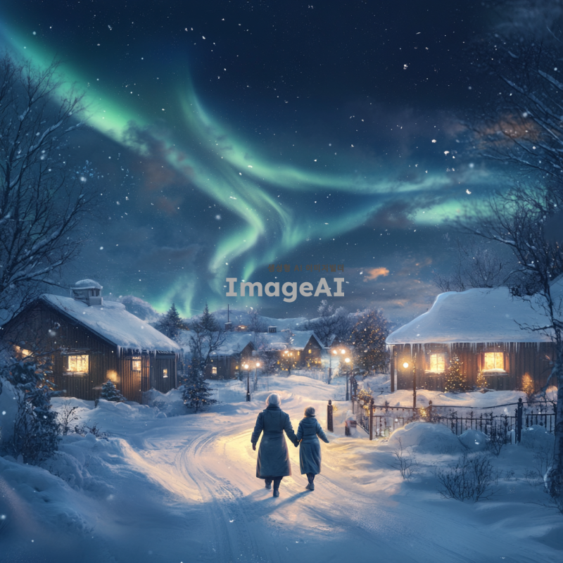 눈 덮인 마을을 걷고 있는 60대 엄마와 30대 중반 딸, 오로라가 하늘에 펼쳐진 배경, 따뜻한 겨울 옷을 입고 있으며 싸우기 직전의 모습, 주변에 눈으로 덮인 작은 집들과 나무들, 어두침침한 스릴러 분위기, 밤하늘의 오로라가 마을을 은은하게 비추는 장면.
