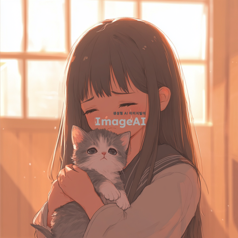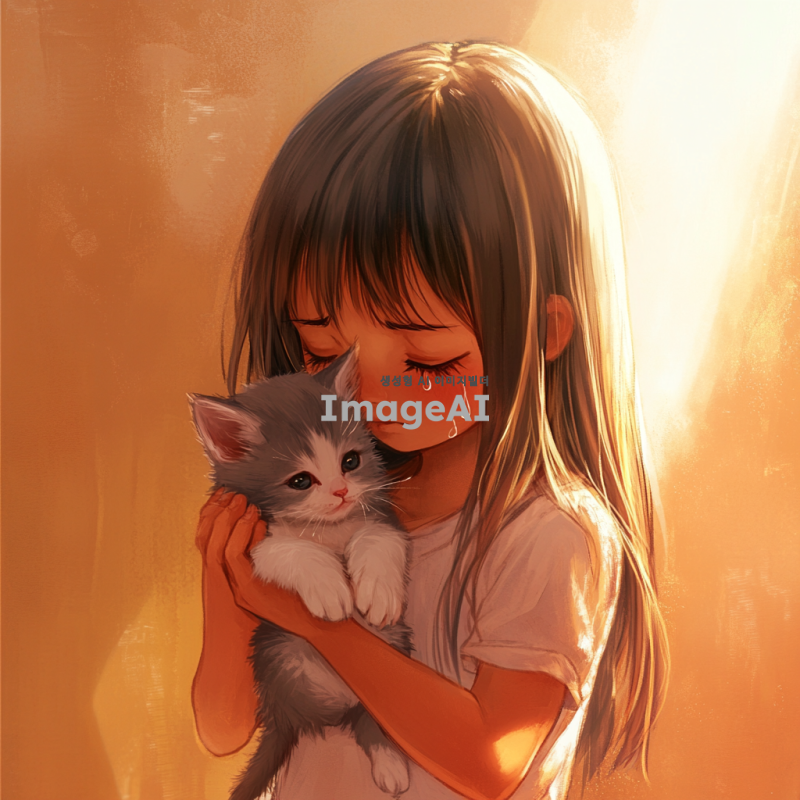 초등학교 여학생이 슬픈 표정으로 작은 새끼 고양이를 안고 있는 모습. 소녀의 눈에는 눈물이 맺혀 있고, 고양이는 부드럽고 약간 지친 모습으로 소녀의 팔에 안겨 있다. 배경은 따뜻한 색감의 실내 공간으로, 소녀와 고양이에게 집중될 수 있도록 단순하게 표현. 소녀는 긴 생머리에 캐주얼한 옷차림을 하고 있으며, 고양이는 회색과 흰색 털을 가진 작고 귀여운 모습.