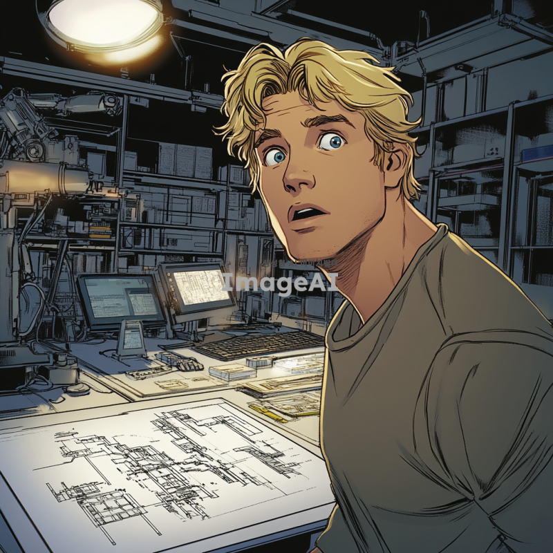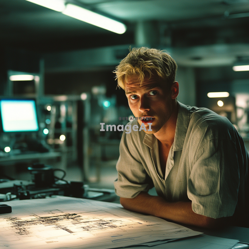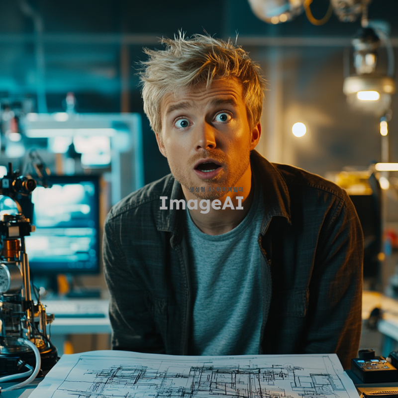 금발 머리를 가진 남자가 로봇 제작 소식을 듣고 놀란 표정을 짓고 있는 모습. 남자는 캐주얼한 옷차림을 하고 있으며, 주변에는 로봇 설계도가 펼쳐져 있는 테이블이 있다. 방 안은 현대적인 연구실 분위기로, 컴퓨터와 다양한 전자 장비들이 배치되어 있다. 남자의 표정은 호기심과 흥미를 동시에 느끼는 듯하며, 배경에는 밝은 조명이 연구실을 비추고 있다.