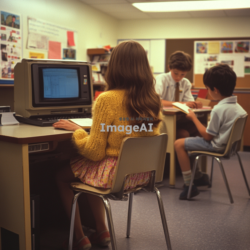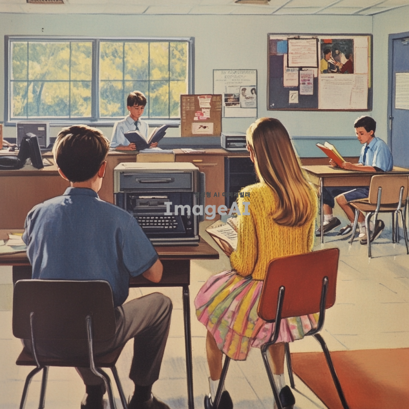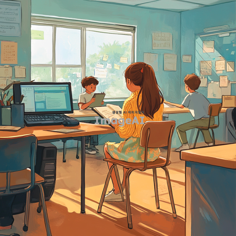 초등학교 교실이야. 선생님은 선생님의 자리에서 컴퓨터를 보고 작업을 하고 있어. 한 남학생이 맨 뒤자리에 앉아 있어. 맨 앞에는 긴 생머리에 예쁜 여학생이 앉아 있어. 이 여학생은 노란 앙고라 털 니트를 입고 있고 파스텔 톤의 치마를 입고 있어. 남학생은 그 여학생의 뒷 모습을 바라보고 있고, 여학생은 앉아서 책을 읽고 있어. 이 때 뒷 문으로 장난꾸러기 남학생 한 명과 키가 작은데 놀림을 받고 있는 남학생이 함께 들어오고 있어. 이 장면을 그려줘