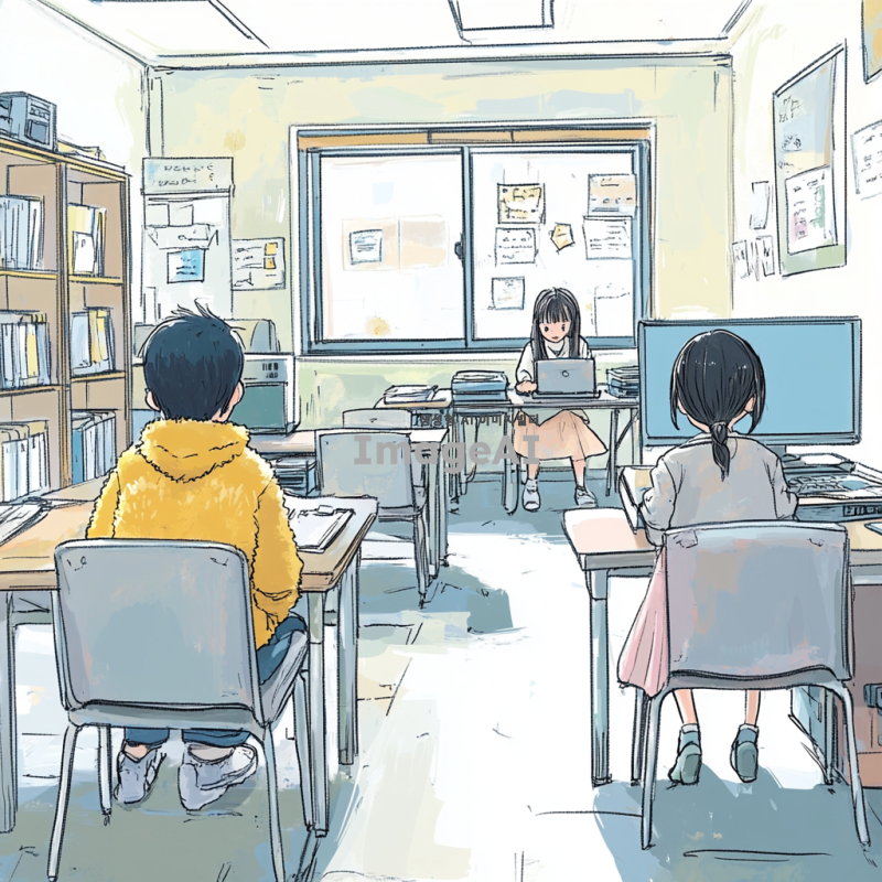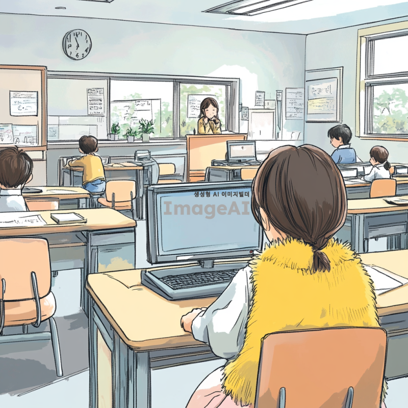 초등학교 교실, 맨 뒤에 앉아 있는 남학생, 맨 앞에 앉아 있는 여학생, 여학생은 노란 앙고라털 니트와 파스텔 톤 치마를 입고 있음, 남학생은 여학생을 바라보고 있음, 밝고 따뜻한 교실 분위기. 선생님은 선생님 자리에 앉아 컴퓨터 작업을 하고 있어. 이 장면을 만화 느낌으로 그려줘