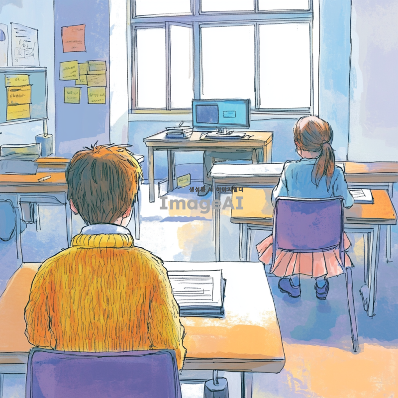 초등학교 교실이야. 한 남학생이 맨 뒤에 앉아 있고 한 여학생이 맨 앞에 앉아 있어. 여학생은 노란 앙고라털 니트에 파스텔 톤 치마를 입고 있어. 남학생은 여학생을 쳐다보고 있어.
