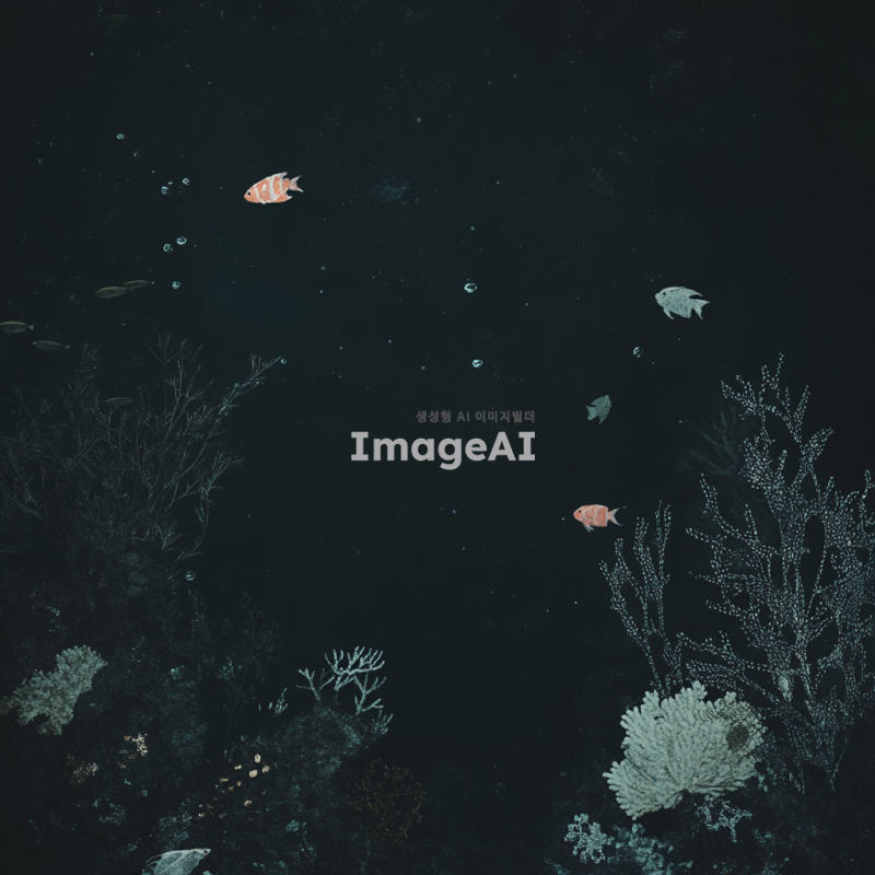 어두운 바다 속, 다양한 물고기들이 헤엄치는 장면. 물고기들은 빛이 거의 없는 깊은 바다 환경에서 서로 흩어져 있어, 그 수가 적어 보인다. 물고기들의 색은 어둡고 희미하며, 주변에는 해초와 산호가 드문드문 보인다. 전체적으로 고요하고 쓸쓸한 분위기를 강조하는 장면.