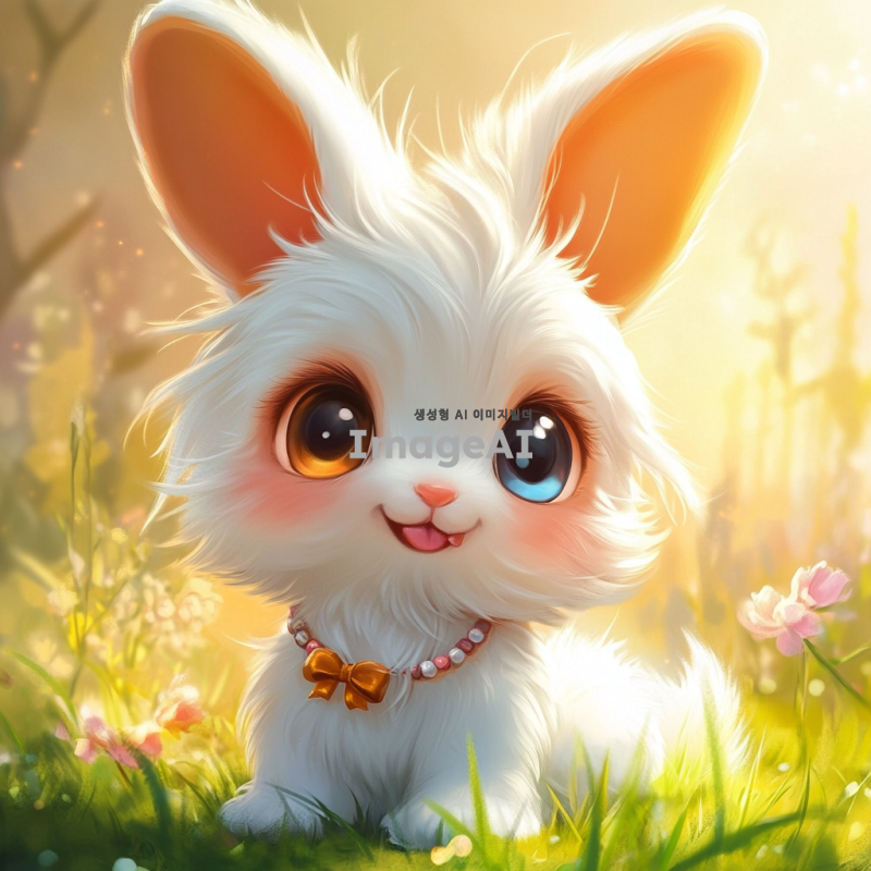 귀여운 토끼 같은 강아지 캐릭터, 큰 귀와 동그란 눈, 부드러운 털, 밝고 활기찬 표정, 작은 코와 입, 파스텔 색상의 털, 귀여운 액세서리로 장식된 목걸이, 초원에서 뛰노는 모습, 따뜻하고 환한 햇살 아래에서 놀고 있는 장면.