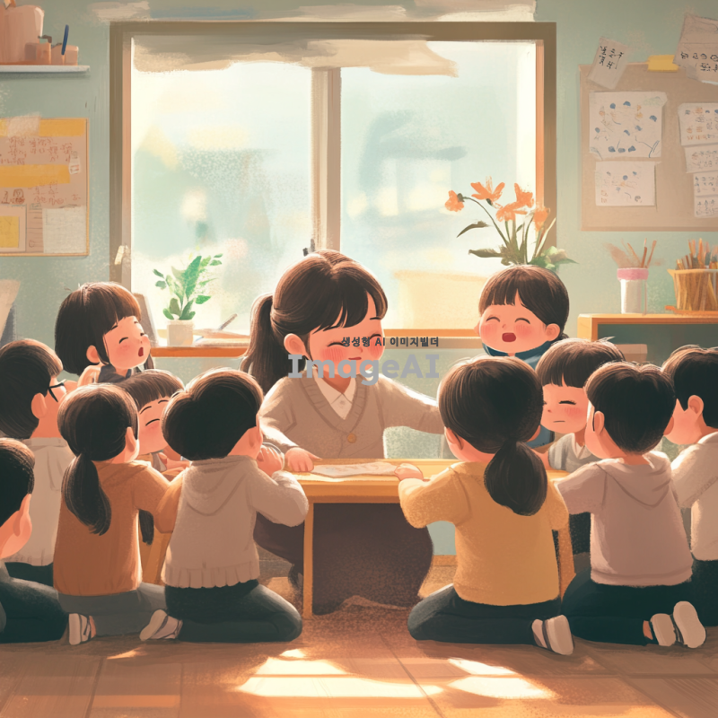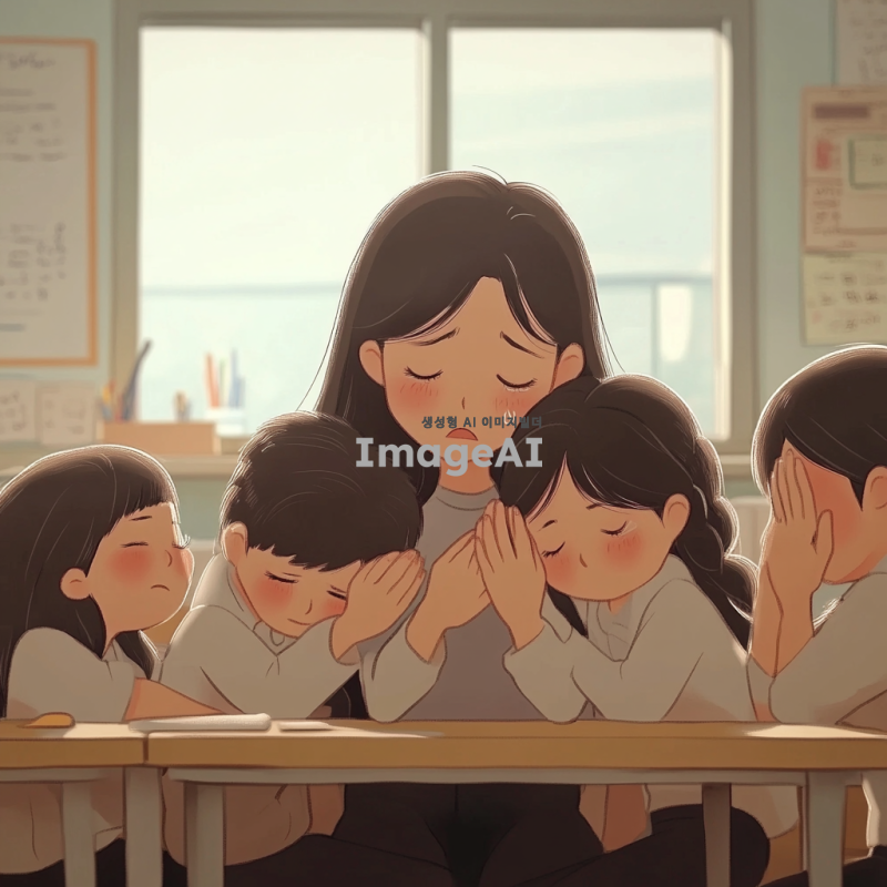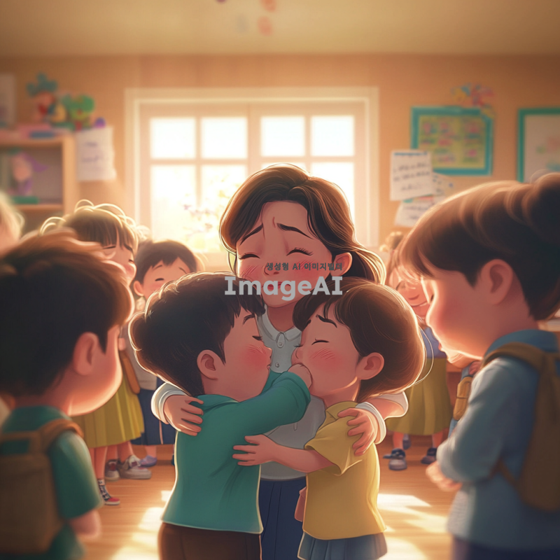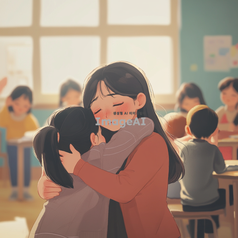 초등학교 교실 내부, 감정이 고조된 장면, 한국인 여교사가 눈물을 흘리며 아이들과 감동적으로 재회하는 모습, 아이들도 감정적으로 눈물을 흘리며 교사를 껴안고 있음, 따뜻하고 감동적인 분위기, 만화 스타일, 부드러운 색감과 선명한 디테일.