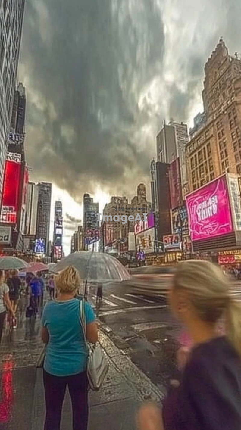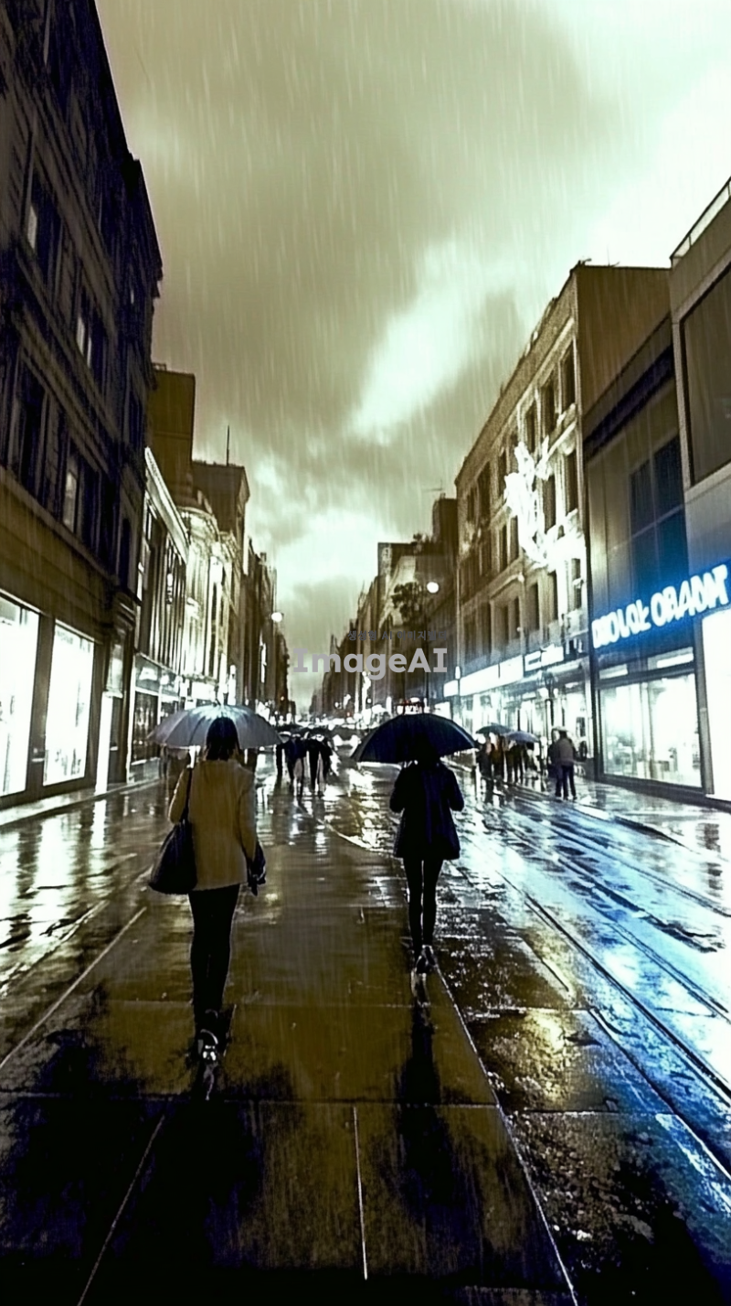 어두운 구름이 드리운 하늘 아래, 빗방울이 떨어지는 번화한 도시의 거리. 거리에는 우산을 쓴 사람들이 바쁘게 걸어가고 있으며, 바닥은 빗물에 반사되어 반짝이고 있다. 거리 양옆으로는 네온사인 간판이 빛나고, 자동차들이 천천히 지나가며 물보라를 일으킨다. 거리의 분위기는 차분하고 서정적이며, 빗소리가 잔잔하게 울려 퍼지는 느낌.
