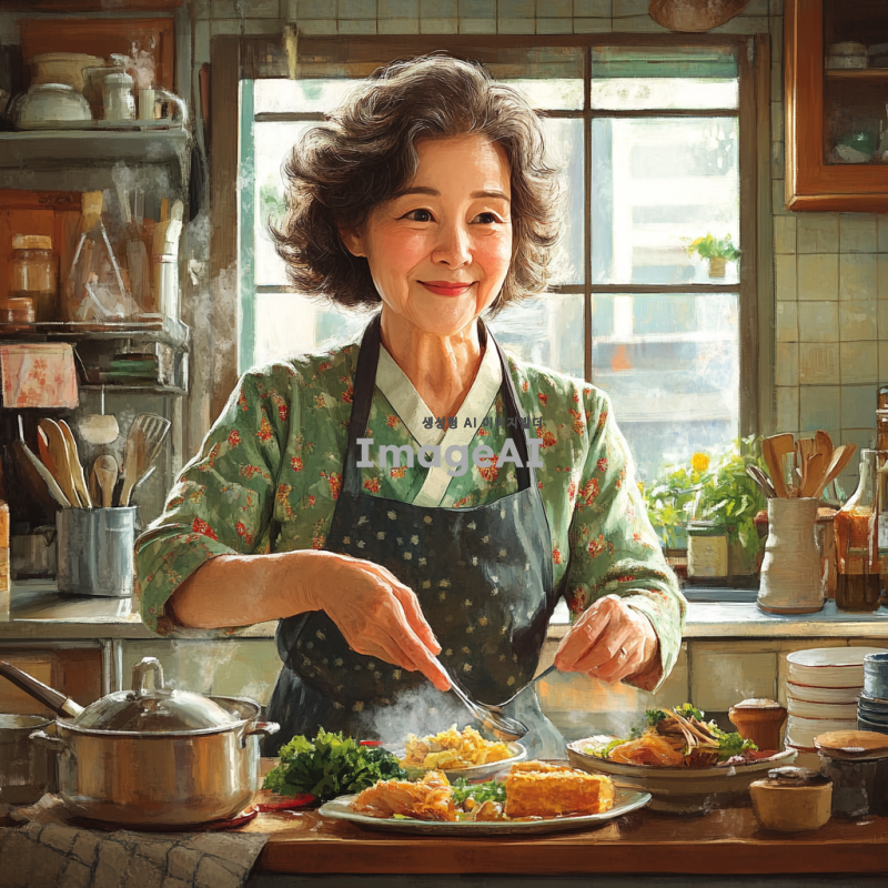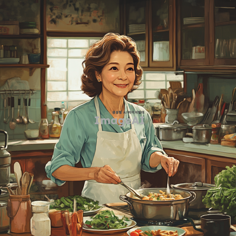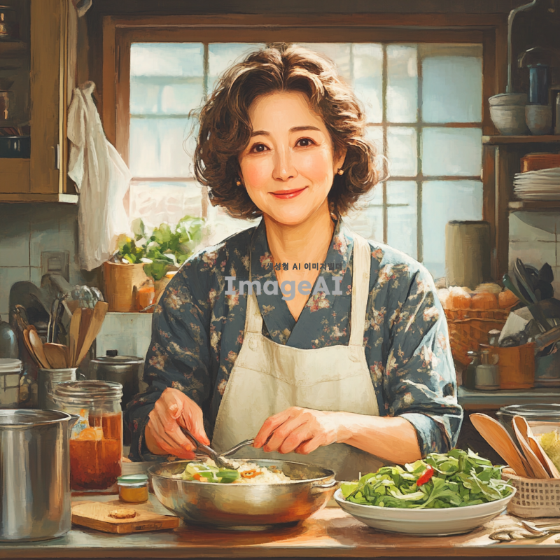 1970년대 스타일의 부엌에서 반찬을 준비하는 중인 중년 여성. 부드러운 웨이브 헤어스타일과 클래식한 옷차림, 따뜻한 미소를 짓고 있는 모습. 주방 도구와 재료들이 주변에 놓여 있으며, 전통적인 한국 가정의 분위기가 느껴지는 장면. 밝고 포근한 색감으로 표현.