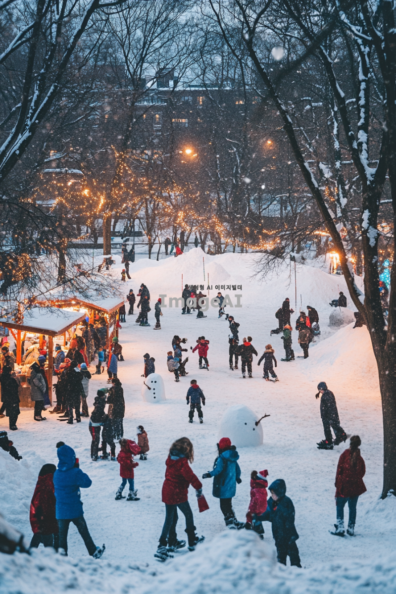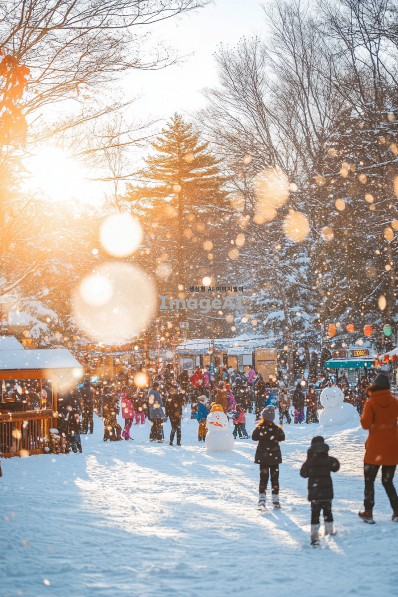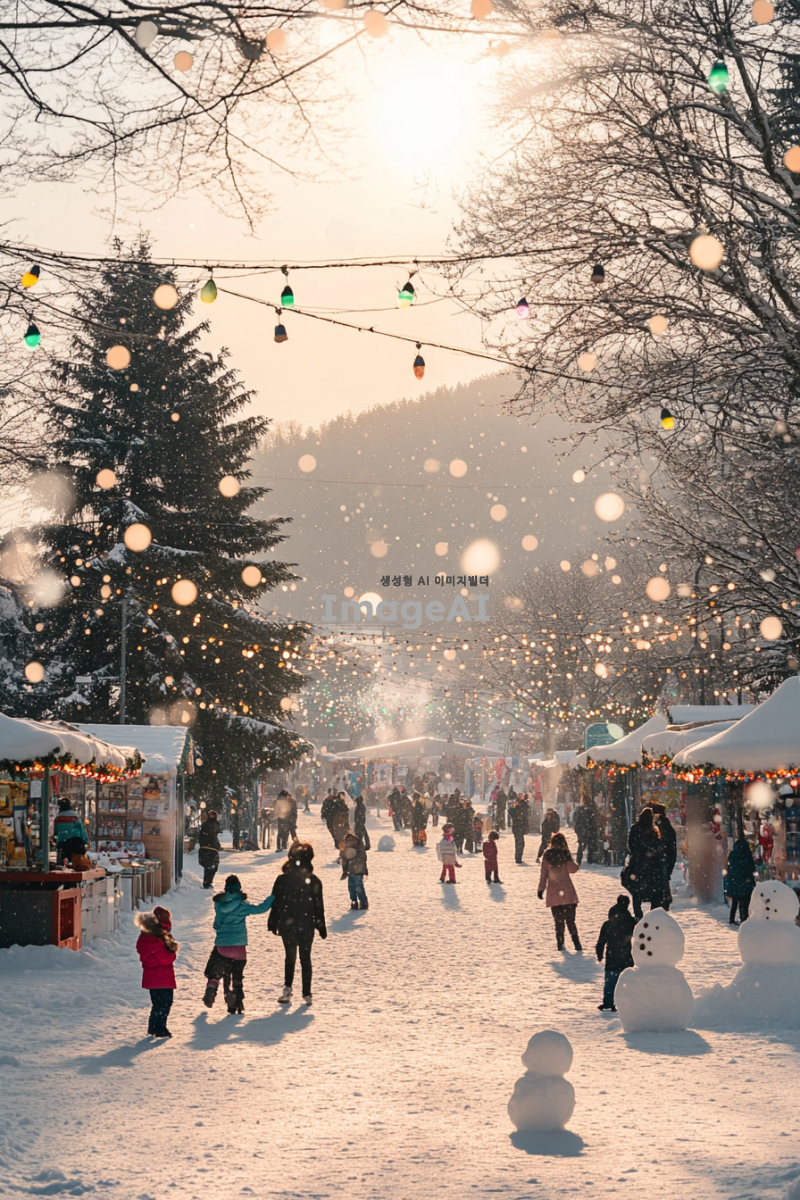 겨울 축제의 활기찬 장면, 눈 덮인 학교 운동장, 눈싸움을 하는 학생들, 눈사람을 만드는 가족들, 따뜻한 코트를 입고 있는 사람들, 축제 장식으로 꾸며진 나무들, 빛나는 조명과 화려한 색상의 겨울 테마 장식, 축제 분위기를 더하는 다양한 부스와 음식점, 뜨거운 코코아를 마시는 사람들, 웃고 즐기는 아이들, 겨울철 스포츠 활동을 즐기는 사람들, 밝고 환한 겨울 하늘, 포근한 겨울의 느낌을 주는 장면.