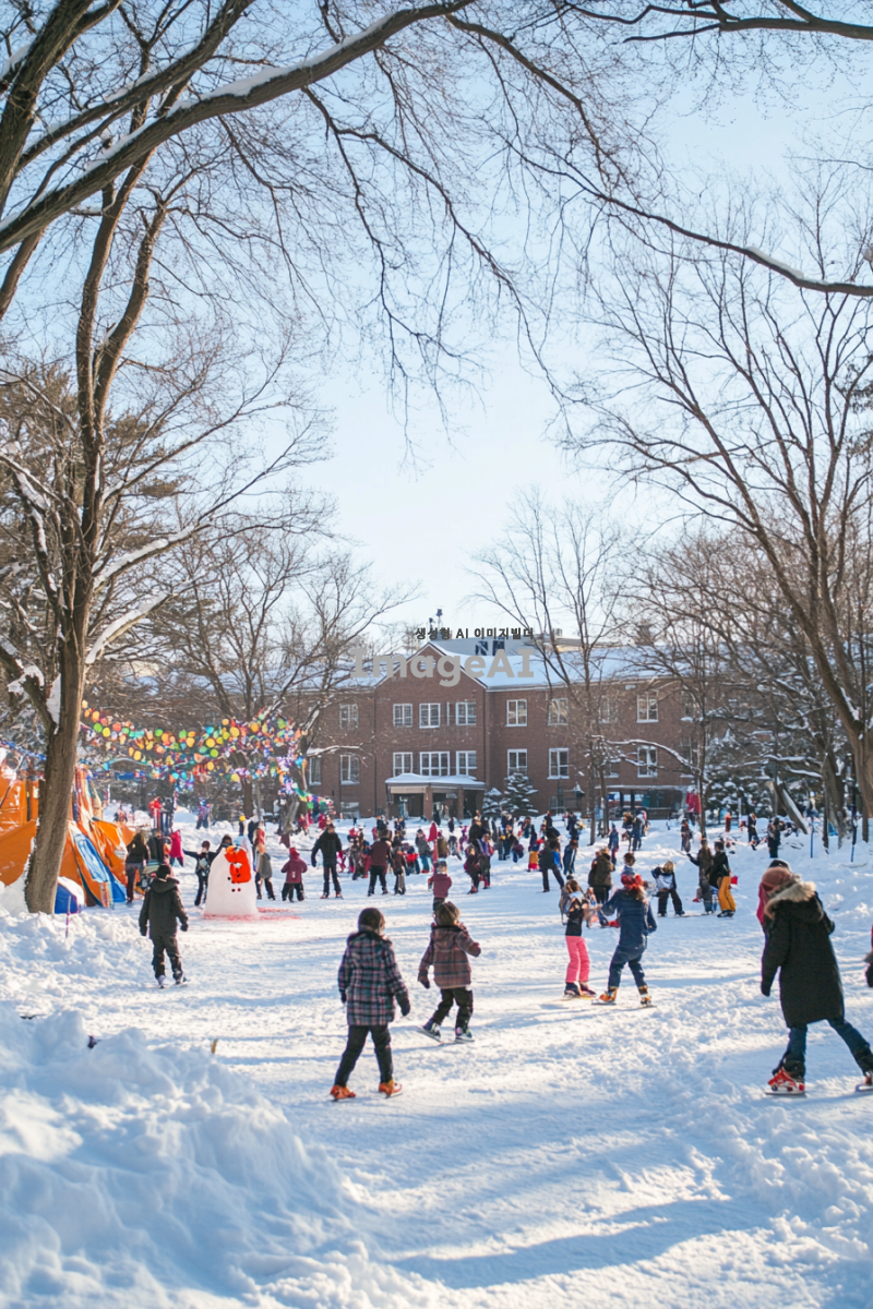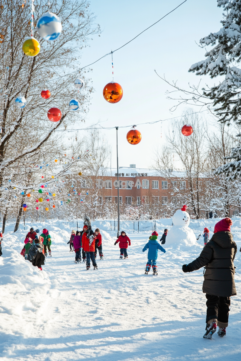 눈 덮인 교정에서 학생들이 다양한 겨울 축제를 즐기고 있는 장면. 아이들은 눈싸움을 하거나 눈사람을 만들고 있으며, 일부 학생들은 스케이트를 타고 있다. 교정 곳곳에는 화려한 겨울 장식과 따뜻한 조명이 설치되어 있고, 나무에는 눈이 쌓여 있다. 학생들은 두꺼운 겨울 옷을 입고 있고, 활기차고 즐거운 분위기가 느껴진다. 배경에는 학교 건물이 보이며, 하늘은 맑고 푸르다.