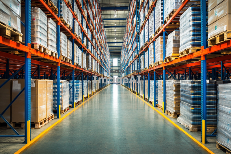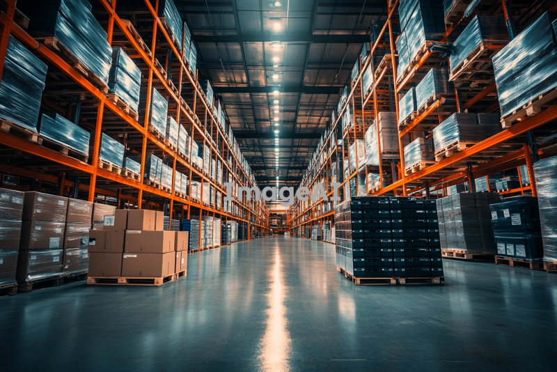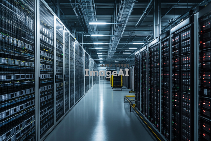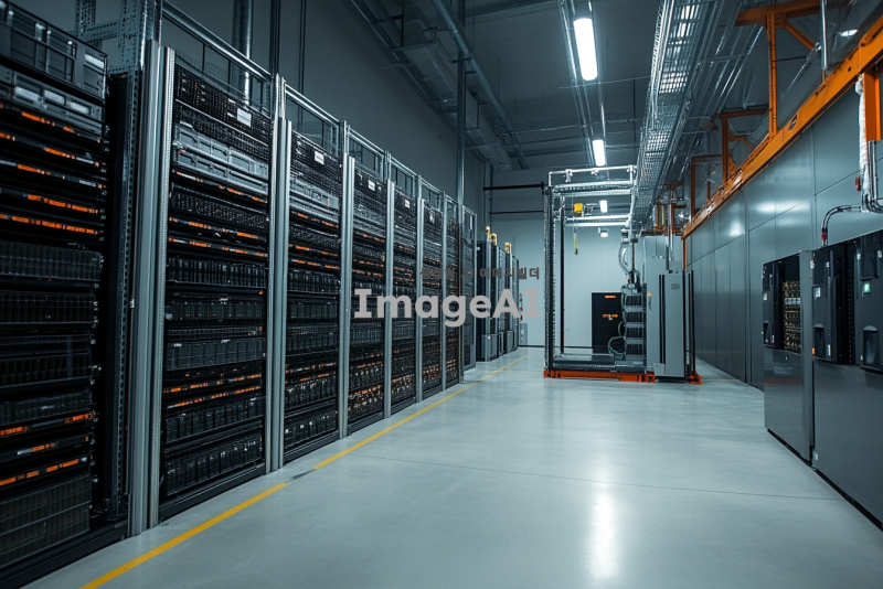 2차전지용 랙과 스태커 크래인, 컨베이어가 있는 현대적인 산업 창고 내부, 첨단 기술과 자동화 시스템을 강조하는 모습, 밝고 깔끔한 조명 아래에서 작업 중인 모습, 효율적인 공간 활용과 정돈된 환경, 산업적이면서도 미래지향적인 분위기.