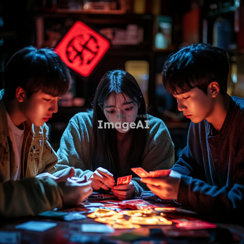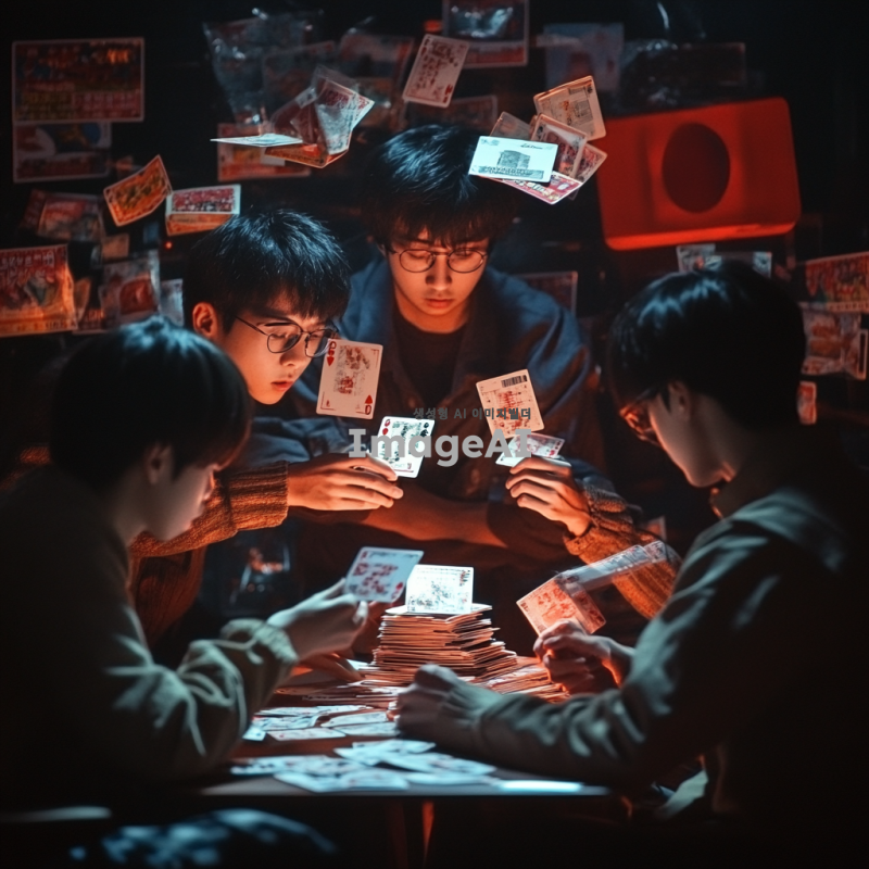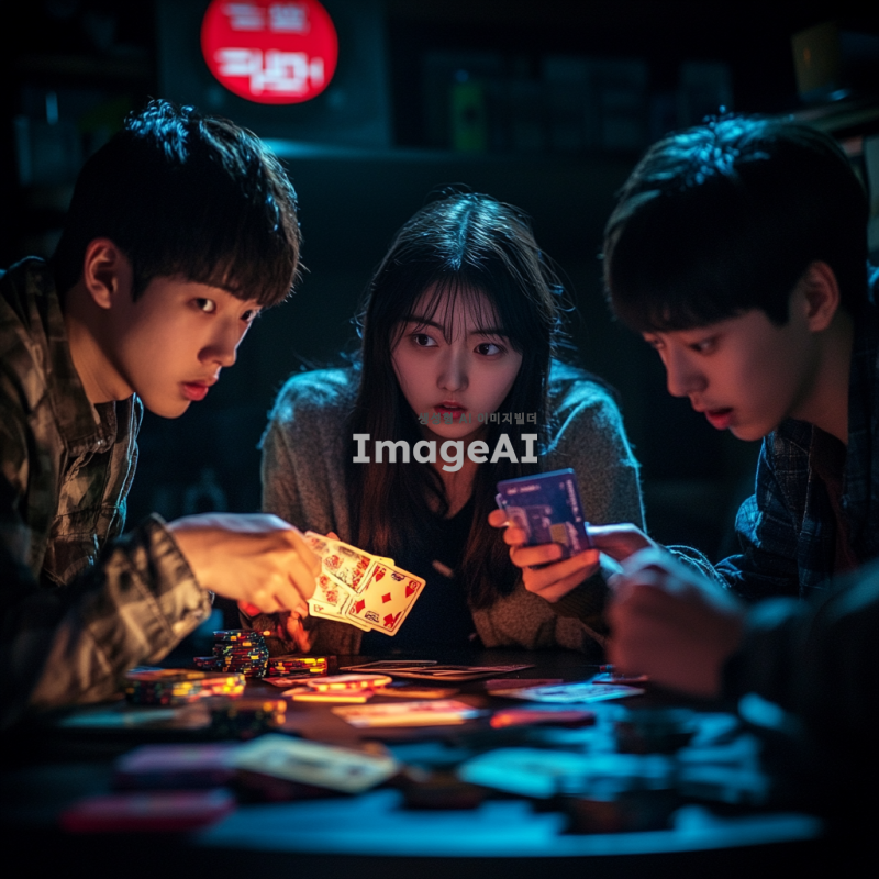어두운 배경에 카드 게임을 하는 한국인 청소년, 주변에는 신용카드와 게임 카드가 흩어져 있다. 청소년의 얼굴에는 걱정과 불안이 가득하며, 화면의 한쪽에는 커다란 빨간색 경고 표시가 있다. 카드 깡의 위험성을 강조하기 위해 카드가 무너지는 탑처럼 쌓여 있는 모습도 포함되어 있다.