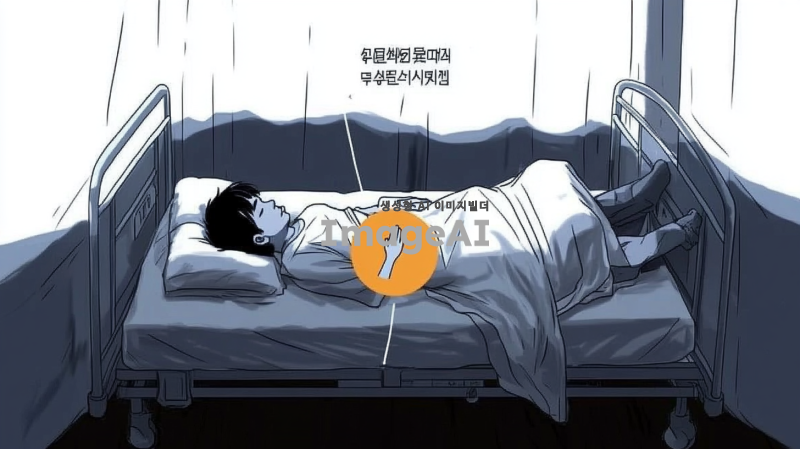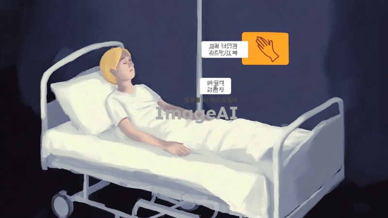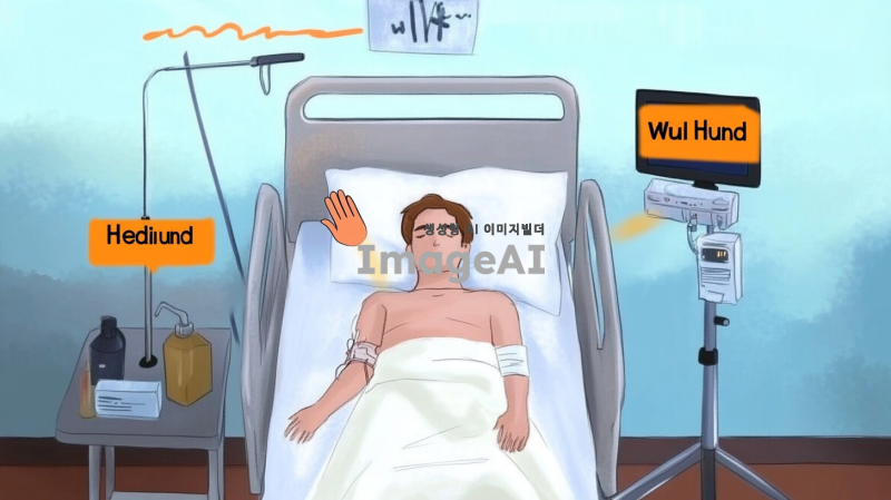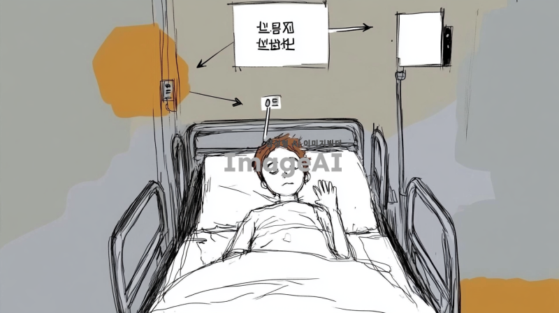 환자가 침대에 누워있는 그림을 그려줘. 애니매이션 모드로 해줘. 이미지를 참고해서 손위생 시점을 모두 넣어줘.