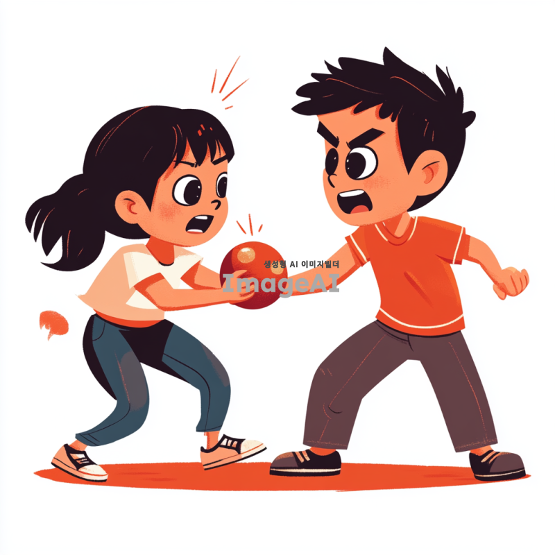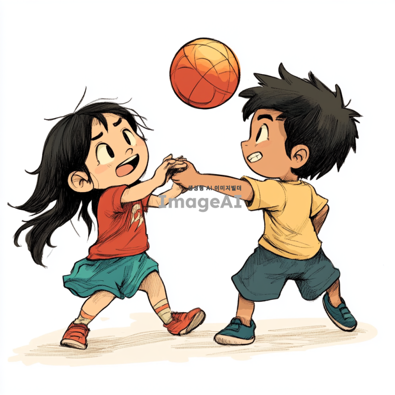 남자 아이가 피구를 하는데 의도적으로 여자 아이를 때려 맞히고 있는 모습을 만화로 그려줘. 둘 다 검은 머리의 아이들이야. 둘 다 외모가 훌륭한 점이 특징이야.