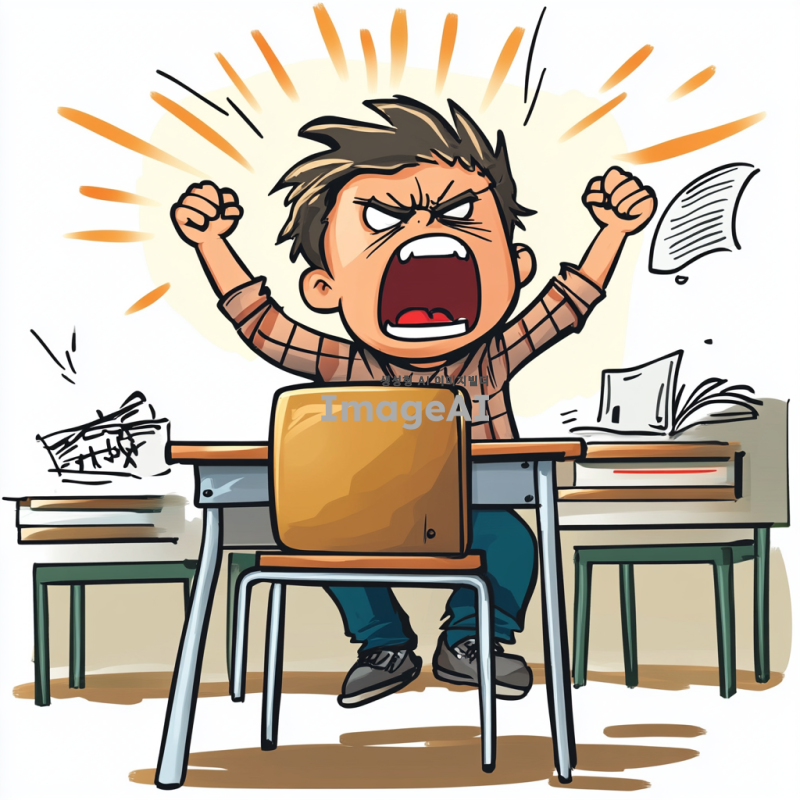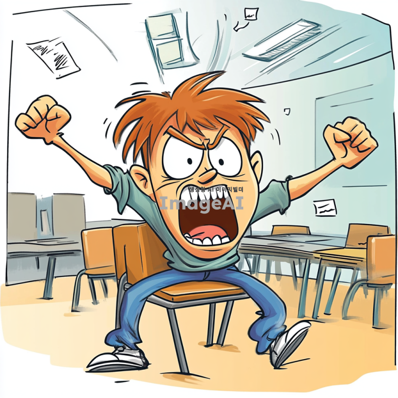 분노에 찬 한 남자 아이가 학교 교실에서 의자를 높이 집어 들고 포효하고 있는 모습을 만화 형식으로 그려줘.