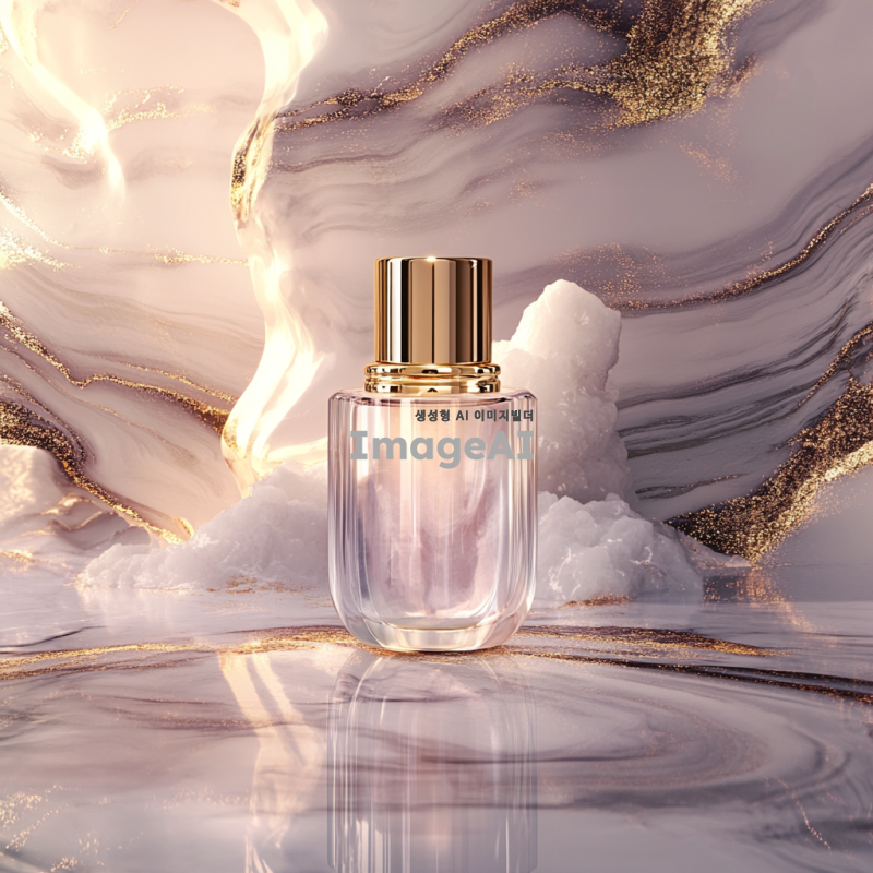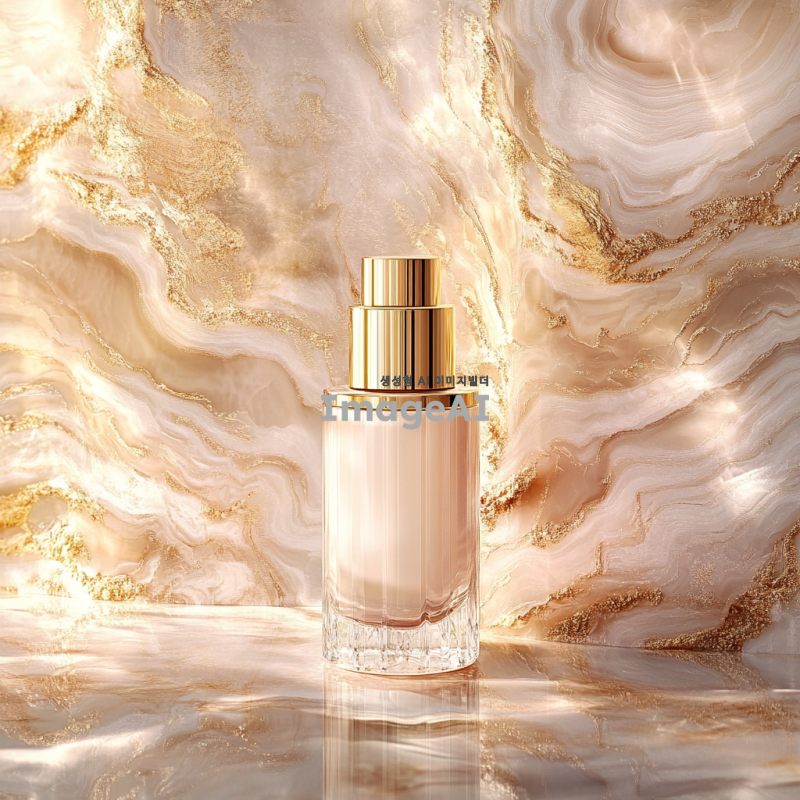 고급스러운 화장품 병이 중앙에 위치한 이미지. 배경은 우아한 대리석 무늬로 장식되어 있으며, 부드러운 조명이 화장품의 윤기를 강조하고 있다. 배경 색상은 화장품의 색조와 조화를 이루며, 전체적으로 세련되고 고급스러운 분위기를 연출한다.