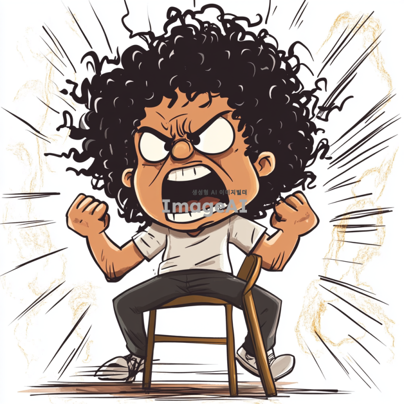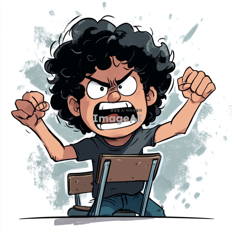 화가 매우 많이 난 검은 뽀글거리는 파마 머리의 남학생이 의자를 집어 들고 포효하고 있는 모습을 만화 형식으로 그려줘