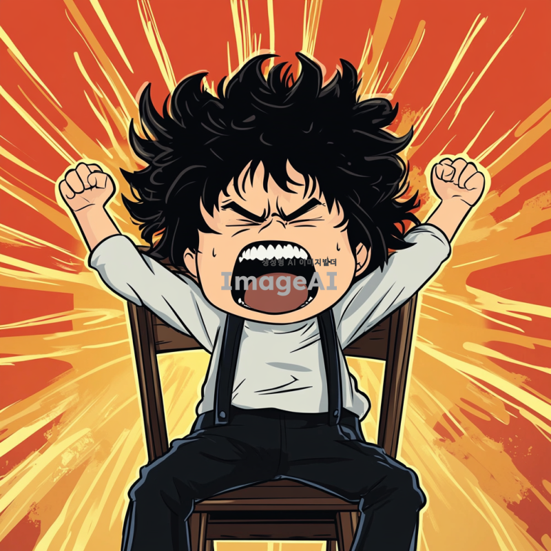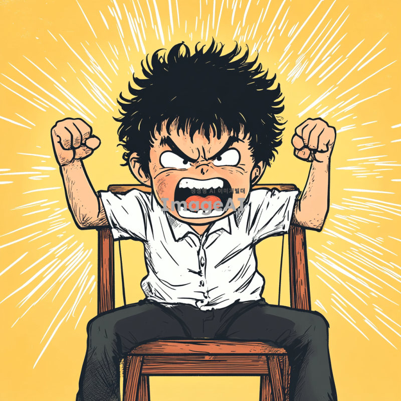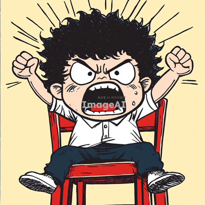 검은 파마 머리의 한 초등 남학생이 화가 나서 의자를 집어 들고 포효하고 있는 모습을 만화 형식으로 그려줘